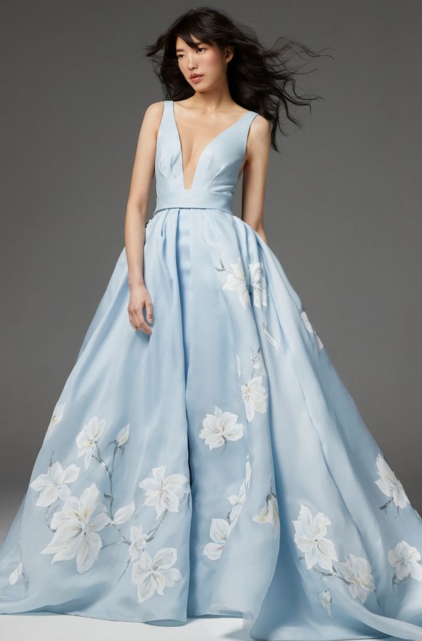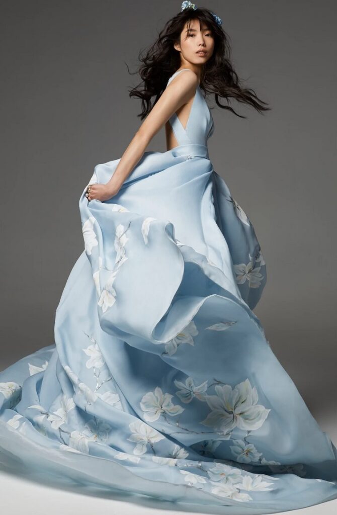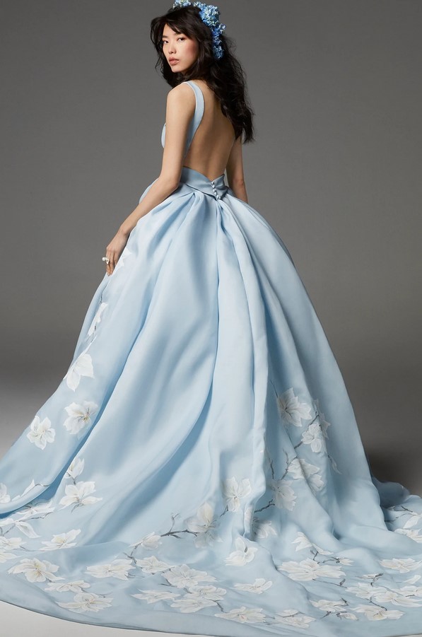 Spicca sicuramente nella collezione l’abito da sposa azzurro "Romina", cocktail dress senza maniche con scollo a V davanti e quadrato sul retro, cui viene abbinata una sopragonna ampia dipinta a mano; un perfetto abito da sposa componibile che permette alla sposa di essere originale e potersi cambiare dalla cerimonia al party con un solo gesto.
