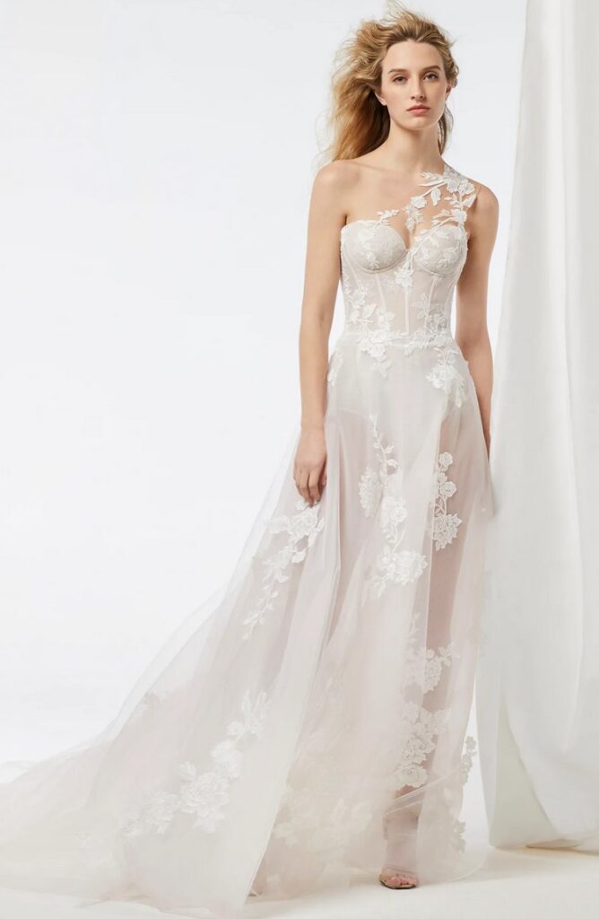 Ancora un delicato abito da sposa monospalla con “Soledad”, un modello A-line velato con applicazioni in pizzo su tutta la lunghezza.