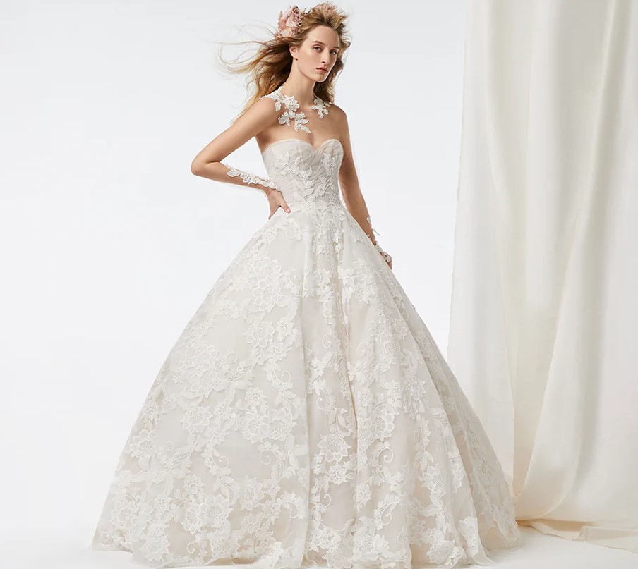 Opulento e glam l’abito da sposa “Alia”, un altro ball gown dai fitti ricami floreali e fazzoletti di tulle.