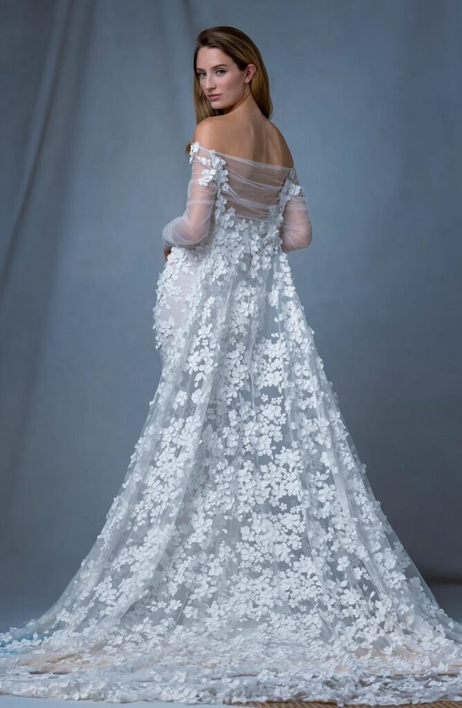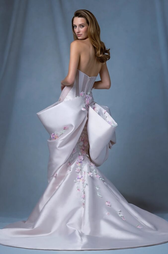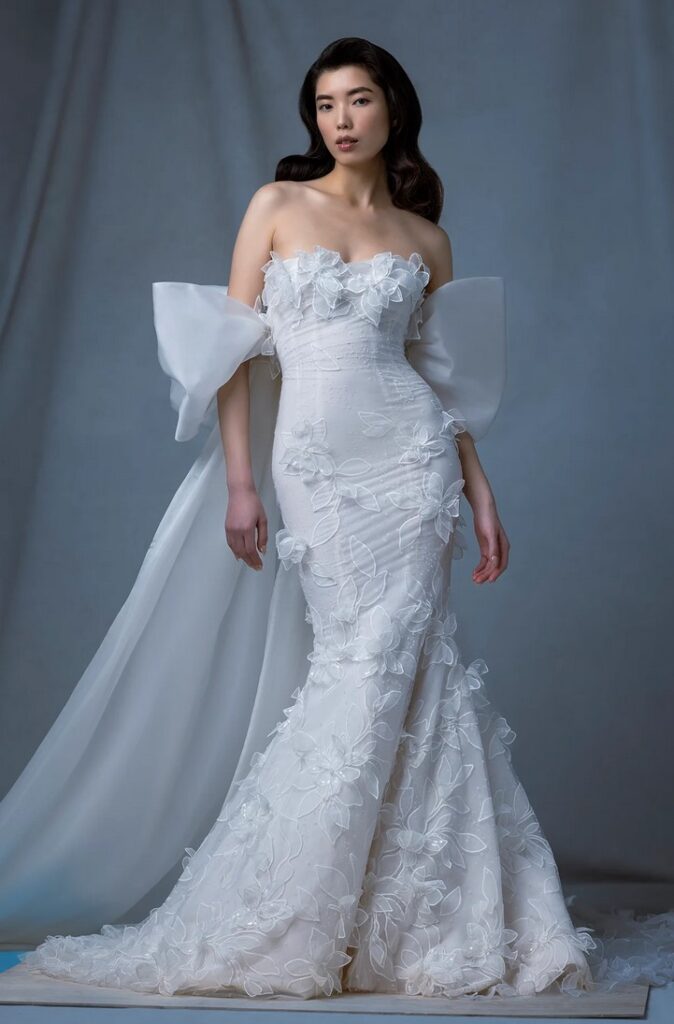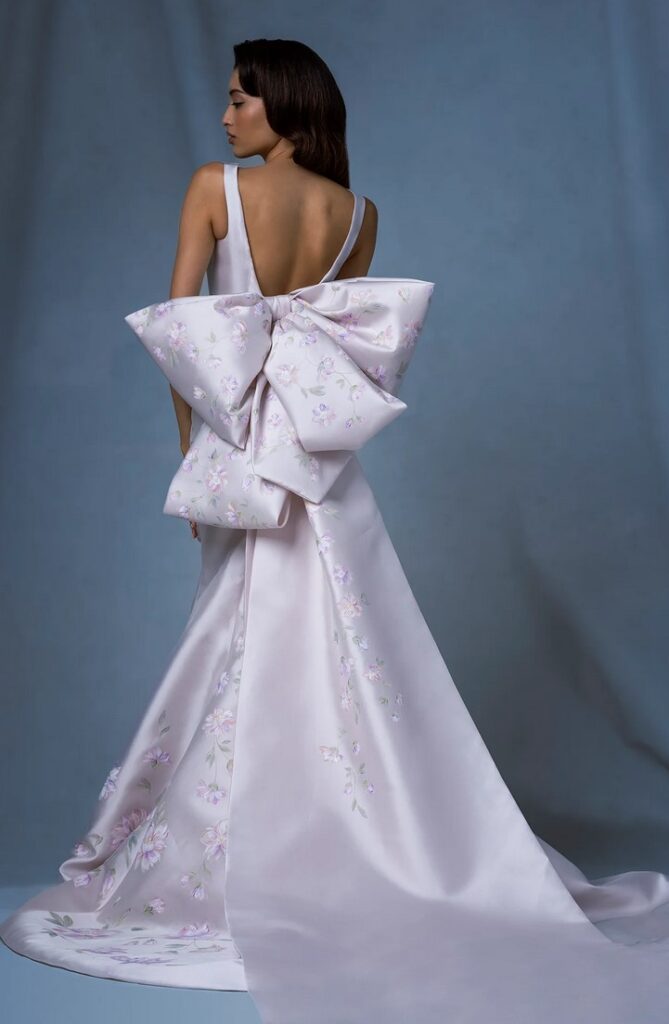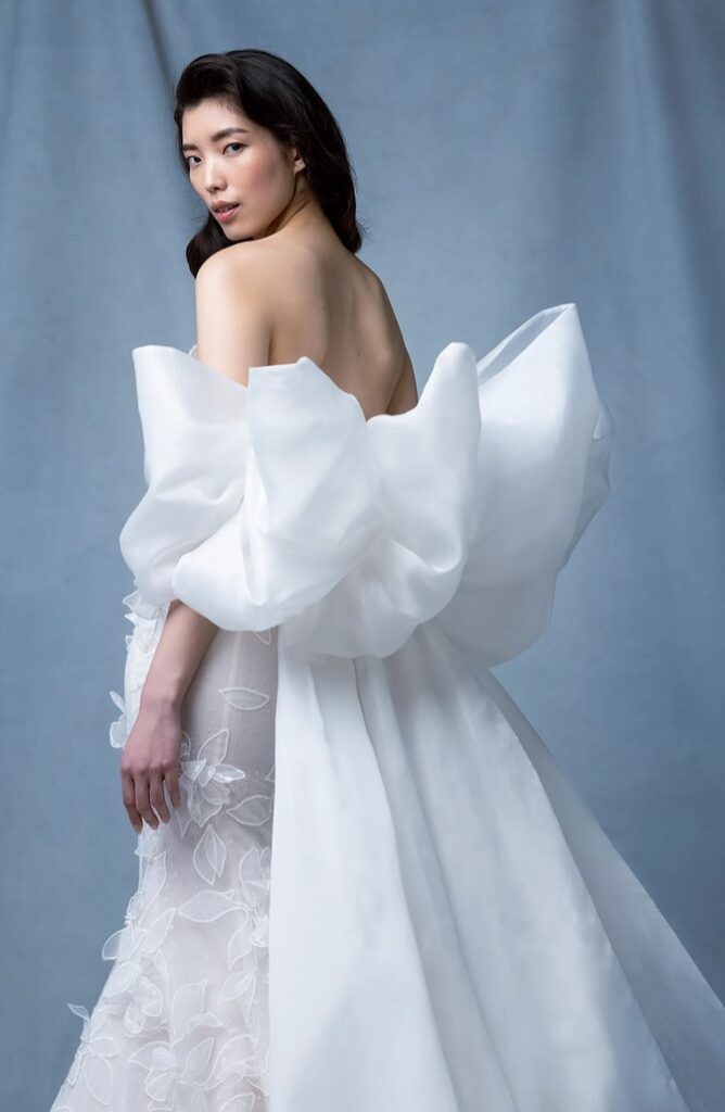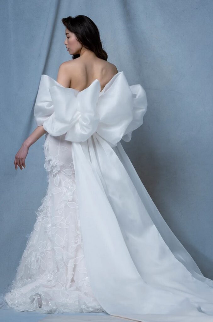 Per chi ama davvero i fiocchi, all’abito da sposa “Basilica” con fiori 3D, è abbinata una con grandi fiocchi sulle spalle.