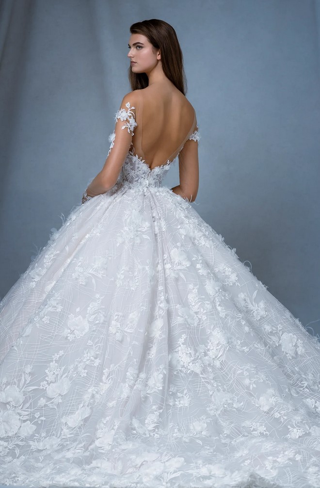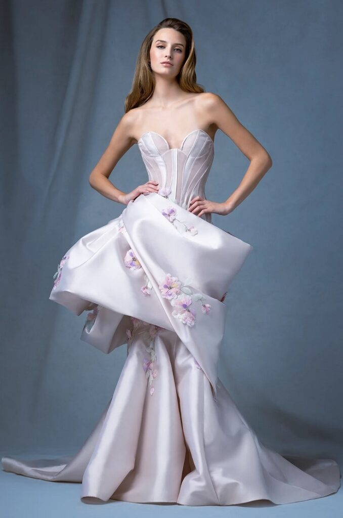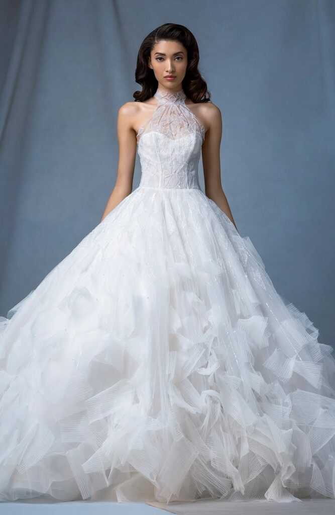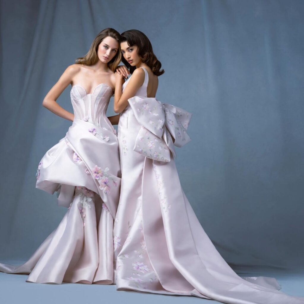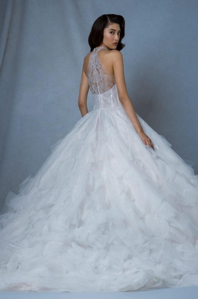I modelli “Arch” e “Atrium”, dalla linea svasata, sono abbelliti da drappeggi, fiocchi, piume e perline e dettagli dipinti a mano.