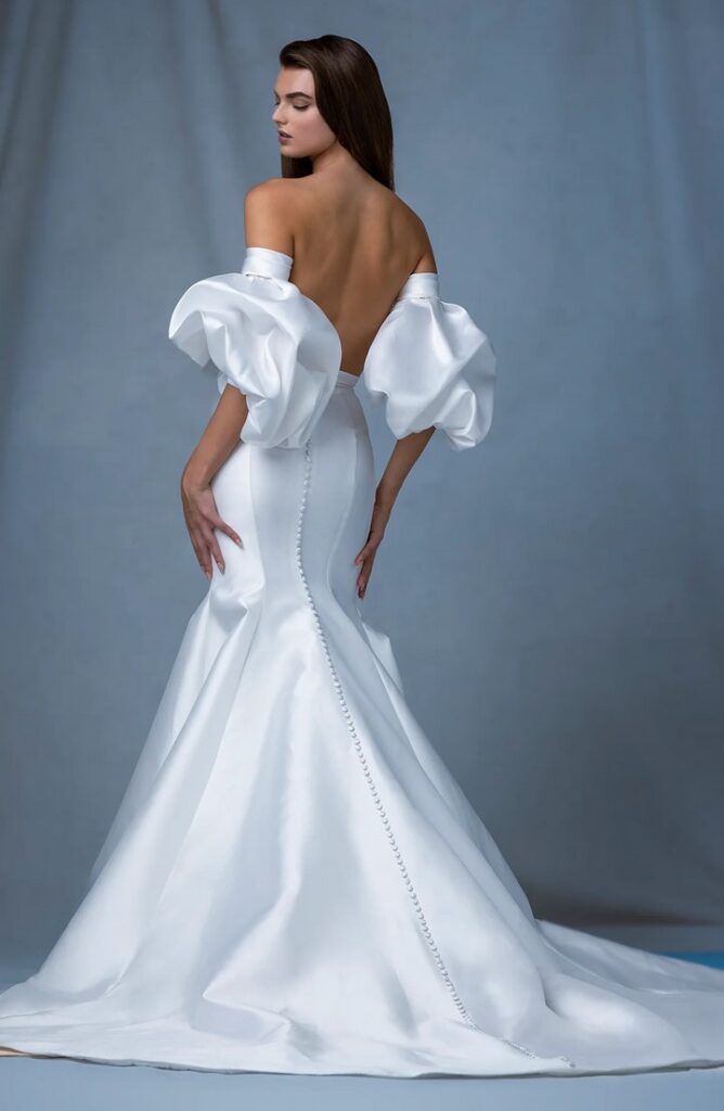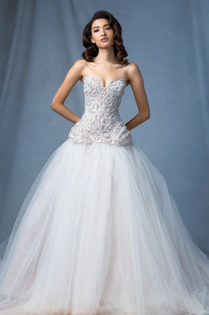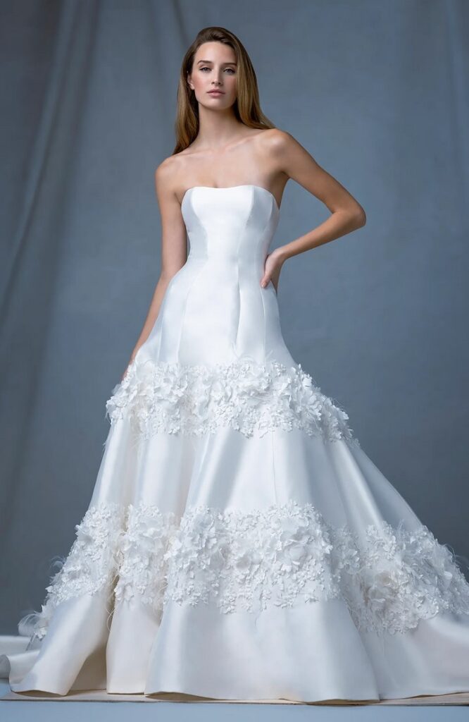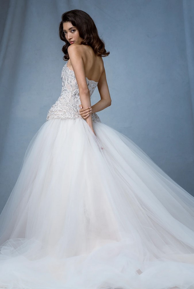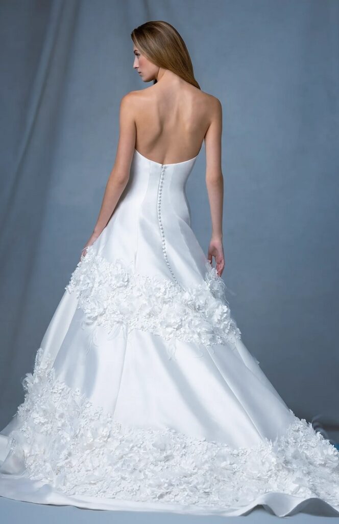 I modelli “Arch” e “Atrium”, dalla linea svasata, sono abbelliti da drappeggi, fiocchi, piume e perline e dettagli dipinti a mano.