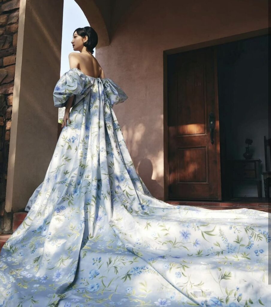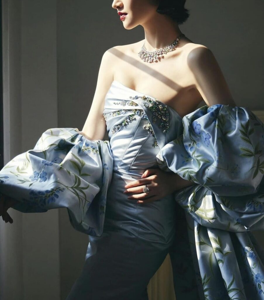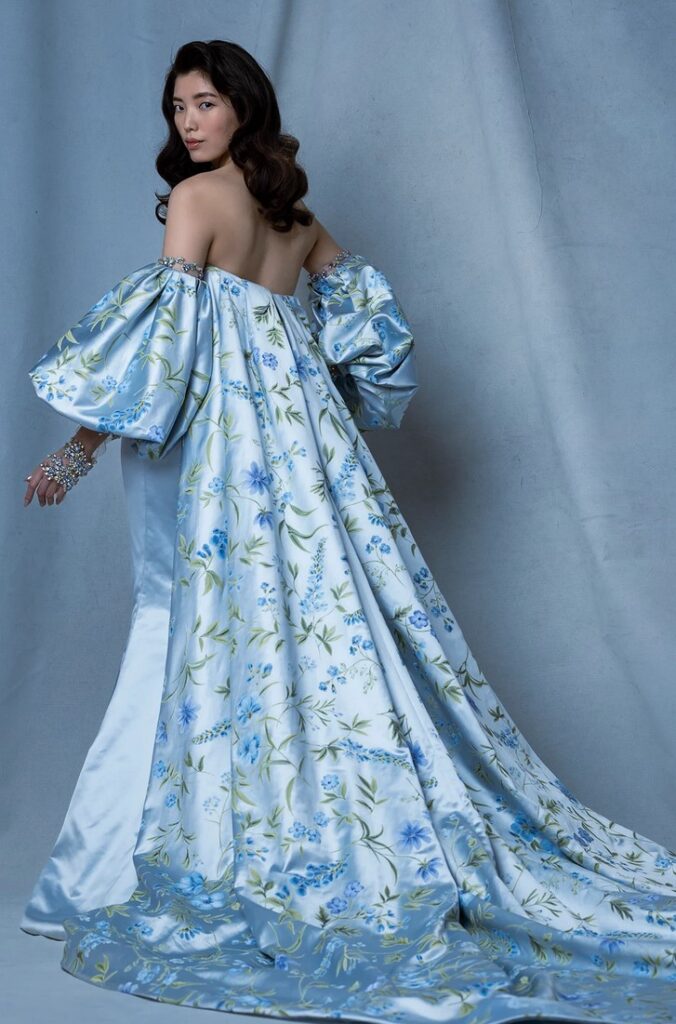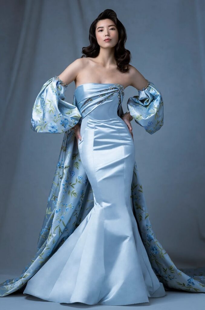 Un vero trionfo della moda couture è l’abito da sposa azzurro “Facade”, un modello svasato drappeggiato senza spalline impreziosito da maniche rimovibili a sbuffo stampate con cristalli e ricca mantella con stampa esotica. Sui polsini della mantella e sul corpetto sono applicati strass colorati per un effetto davvero super glam, come vediamo anche nelle immagini dell’abito indossato dall’attrice cinese Jing Tian.