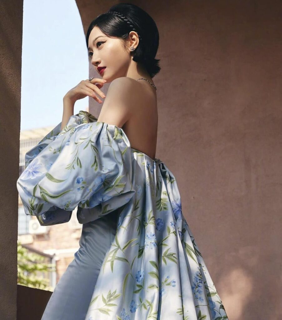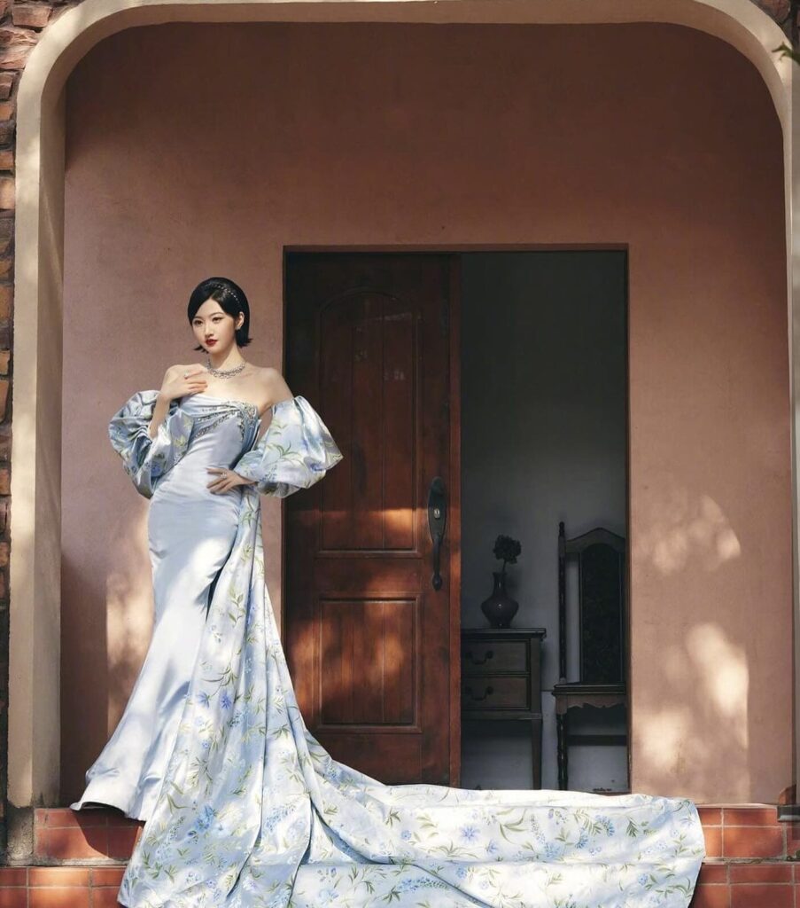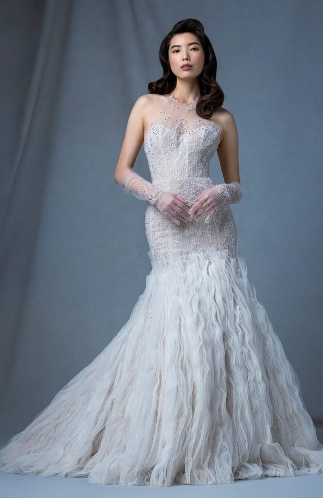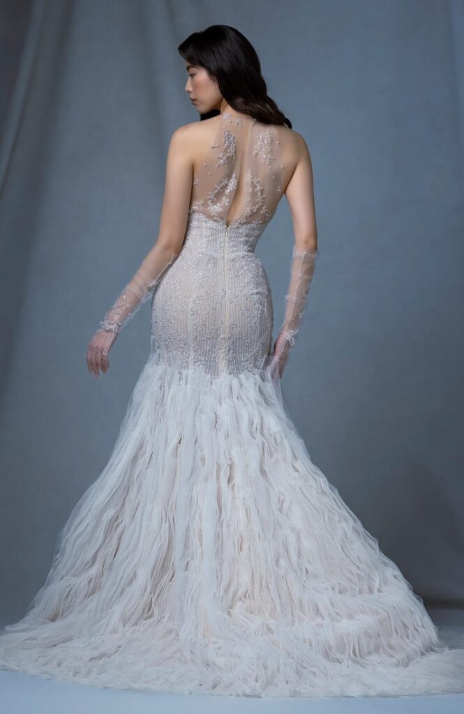 Un vero trionfo della moda couture è l’abito da sposa azzurro “Facade”, un modello svasato drappeggiato senza spalline impreziosito da maniche rimovibili a sbuffo stampate con cristalli e ricca mantella con stampa esotica. Sui polsini della mantella e sul corpetto sono applicati strass colorati per un effetto davvero super glam, come vediamo anche nelle immagini dell’abito indossato dall’attrice cinese Jing Tian.