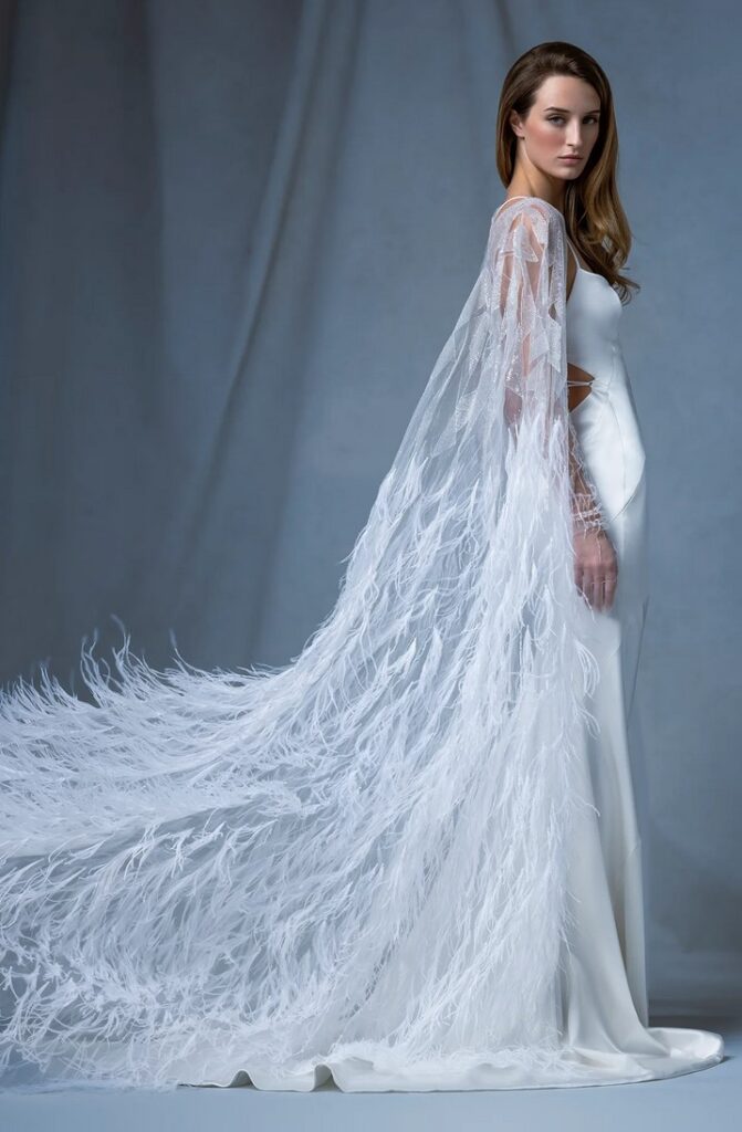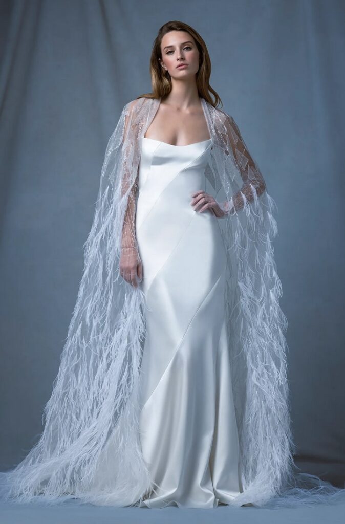 Super sofisticato l’abito svasato “Chevet” con spalline in sbieco, pannelli asimmetrici e schiena a stringhe, abbinato ad una mantella in piume.
