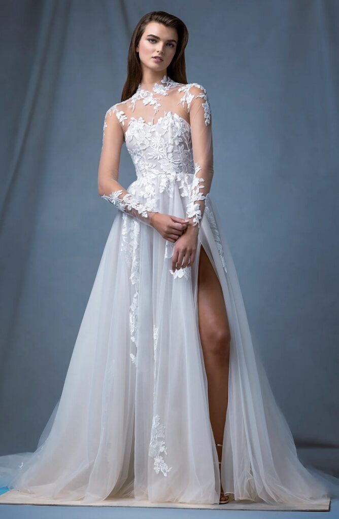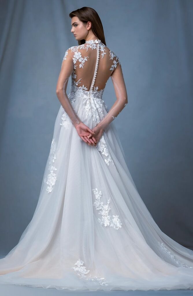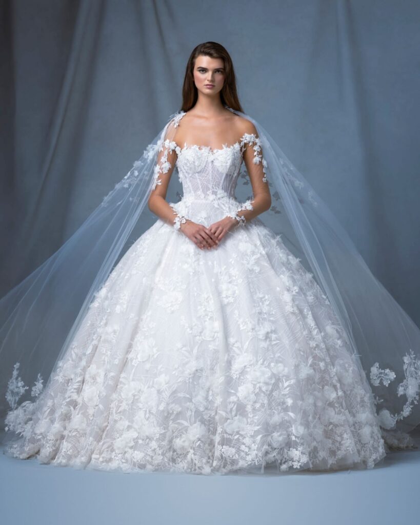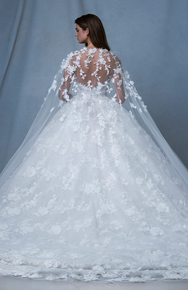 Gran chiusura con il sontuoso abito ampio da principessa “Sash”, con corpetto velato e maniche lunghe, impreziosito da una mantella in pizzo ricamato.