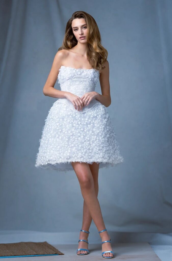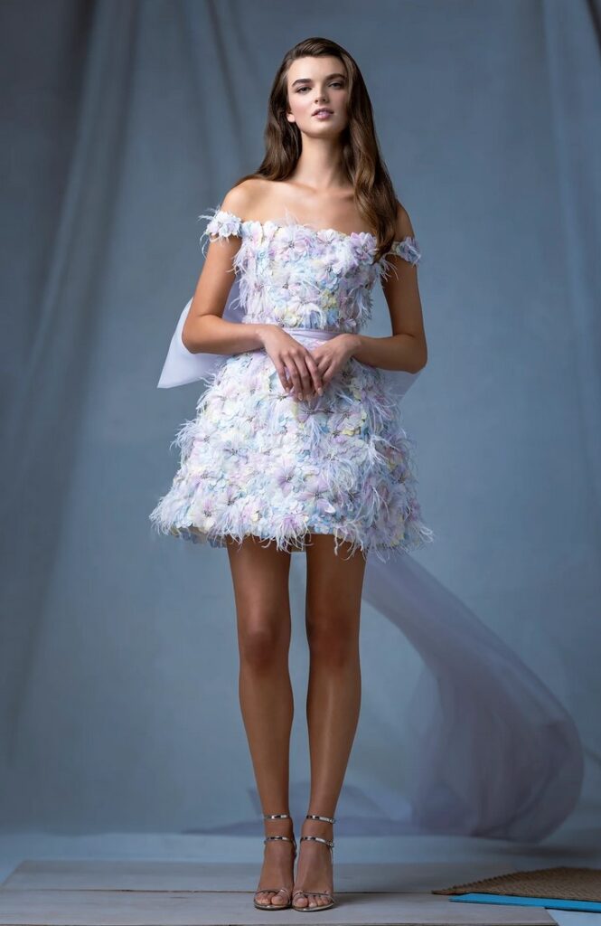 Per la sposa davvero romantica e glam, perfetto il mini dress “Finite”, un modello off the shoulder con fiocco oversize, fiori 3D e piume, tutto in bellissime tonalità pastello.