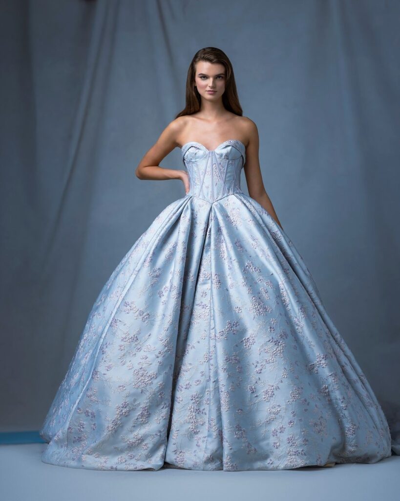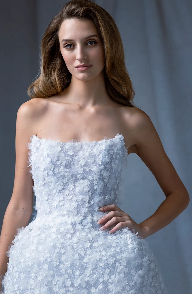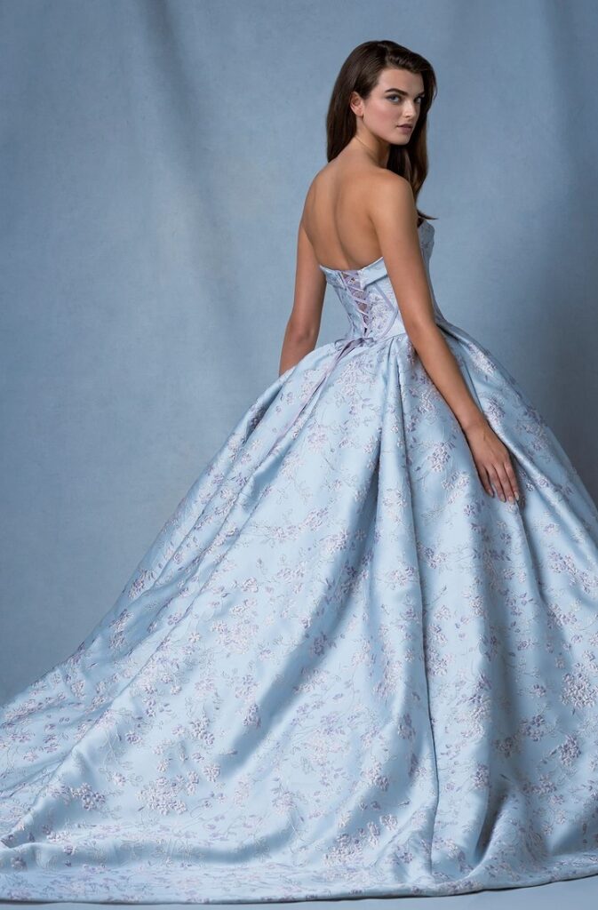 Ancora un abito da sposa azzurro con “Star”, abito da ballo senza spalline a motivo floreale con corsetto e gonna a pieghe invertite.