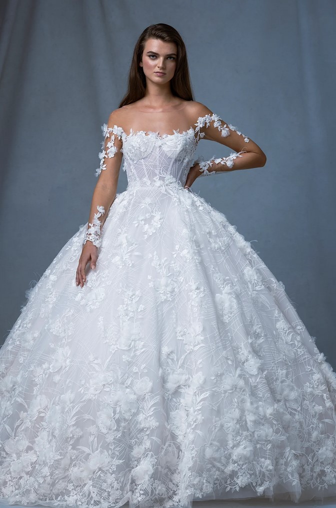 Sugli abiti da sposa architettonici fanno bella mostra di sé deliziosi fiori 3D applicati in file armoniose.