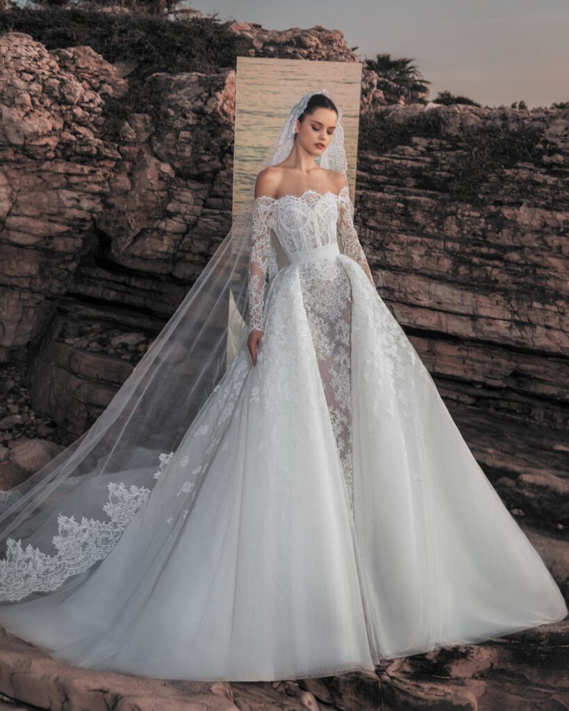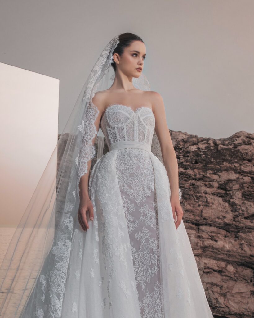 Una collezione, dicevamo, ancora una volta versatile, che comprende abiti da sposa couture abbinabili a sopragonne, boleri e veli preziosissimi.