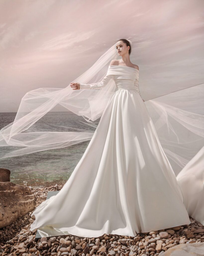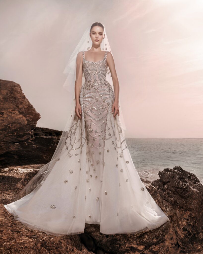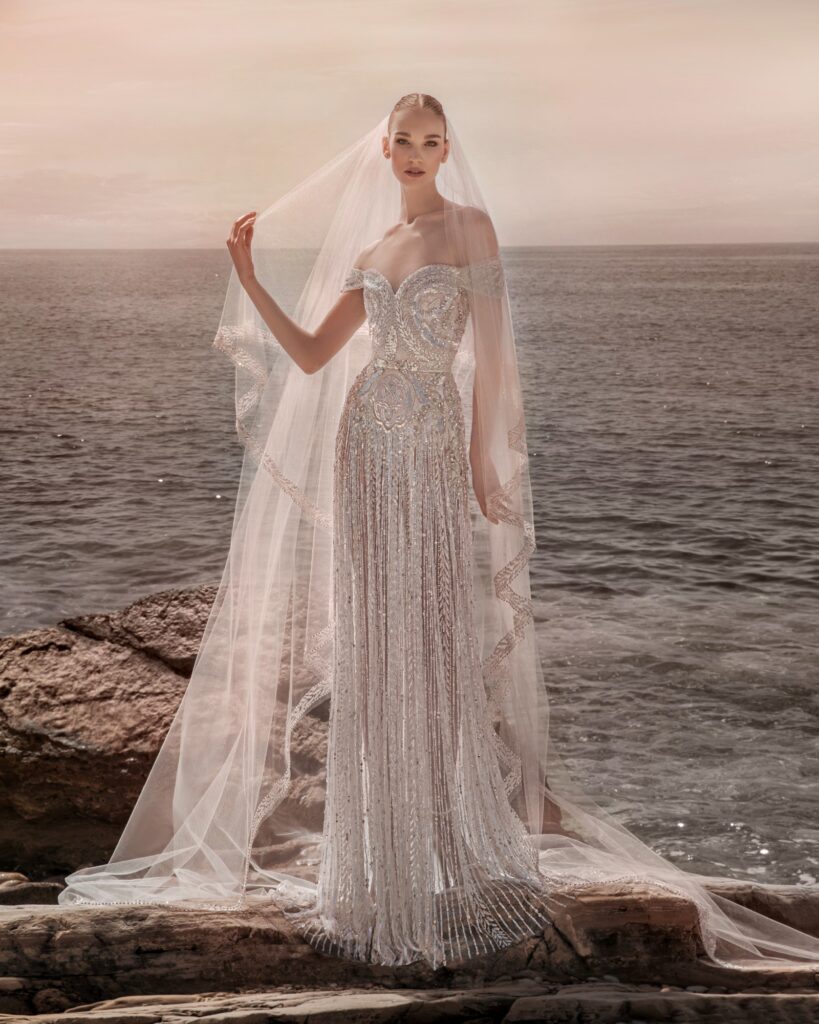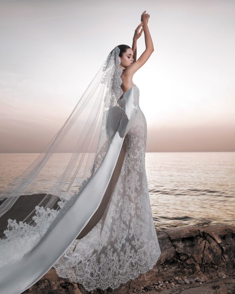 Sempre massima l’attenzione ai dettagli: “Le sculture brillano nei ricami, mentre i cristalli scendono a cascata come le onde del mare. Rami di ulivo e uva si intrecciano con armi classiche, adornando il tessuto e trasformando la sposa in una dea di un'antica leggenda. Una palette di bianco e avorio seduce la collezione, fondendo finezza e purezza e catturando un fascino eterno”, conclude la maison.