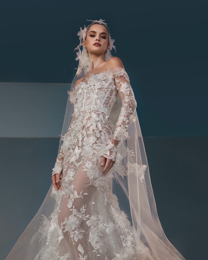 Massima creatività ed artigianalità anche nell’abito da sposa velato con fiori 3D, che avvolge la silhouette della sposa in modo elegante, glam e sensuale, in abbinamento ad ampio velo.