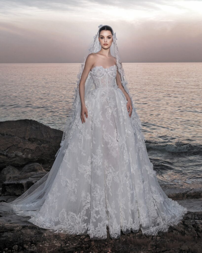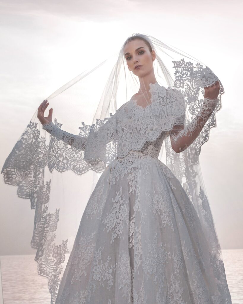 Per chiudere in bellezza, davvero da sogno l’abito da sposa ampio in pizzo abbinato ad un preziosissimo velo o ad un bolero, per chi vuole un bridal look da principessa.