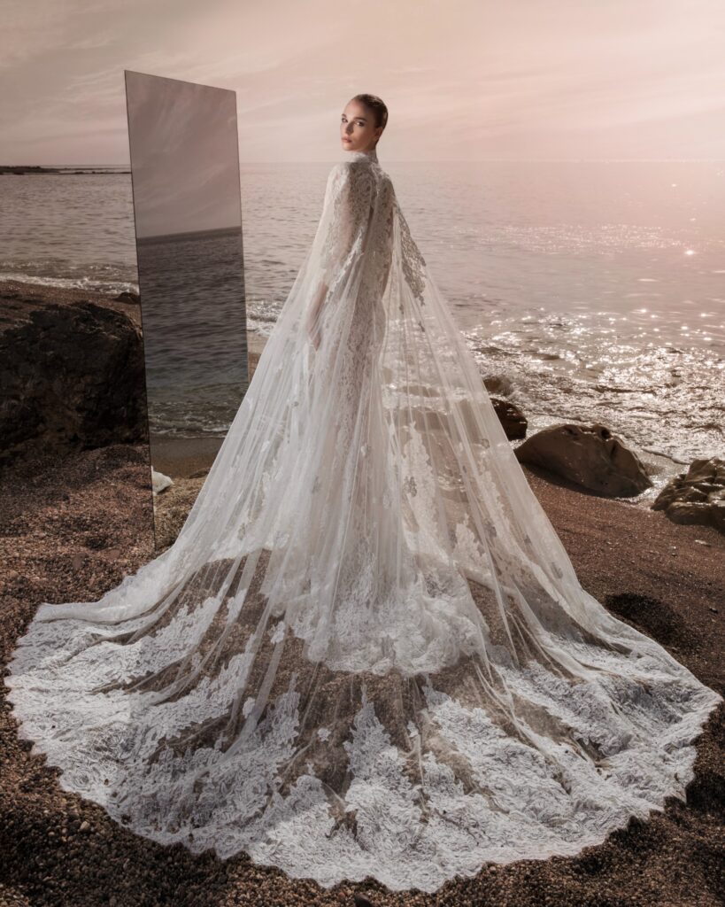 Perfetta per cambiare e completare il look della sposa è la mantella, ampia e preziosa, abbinata alle diverse silhouette.