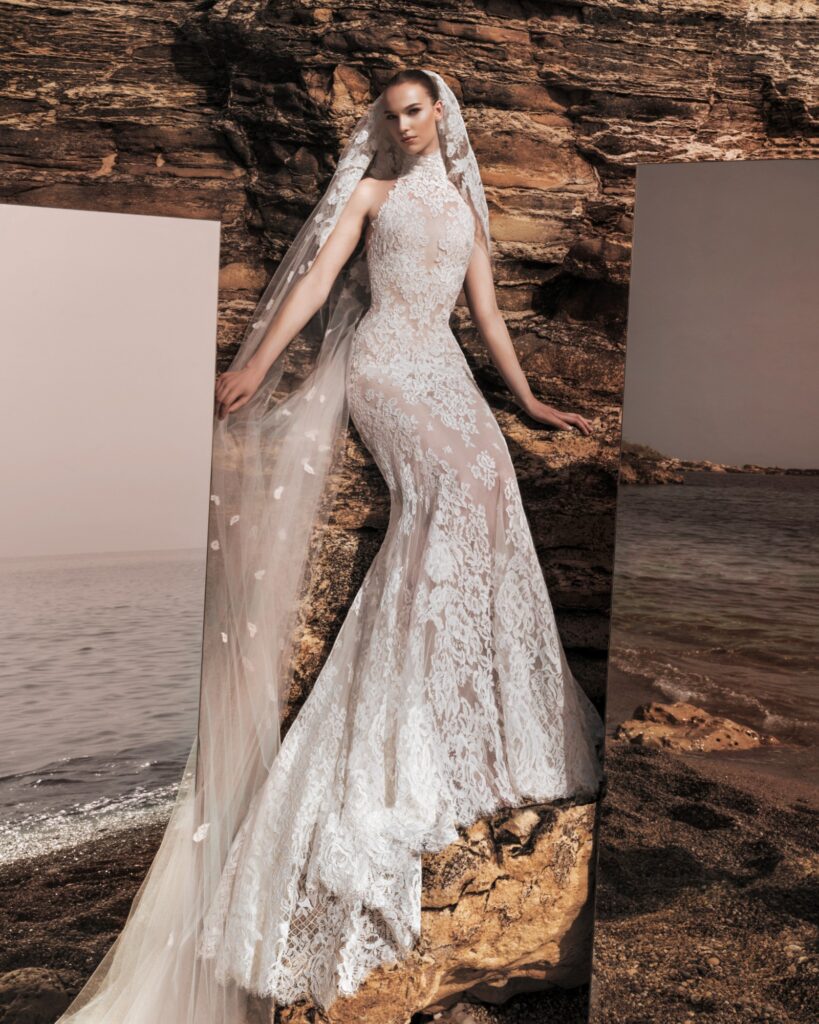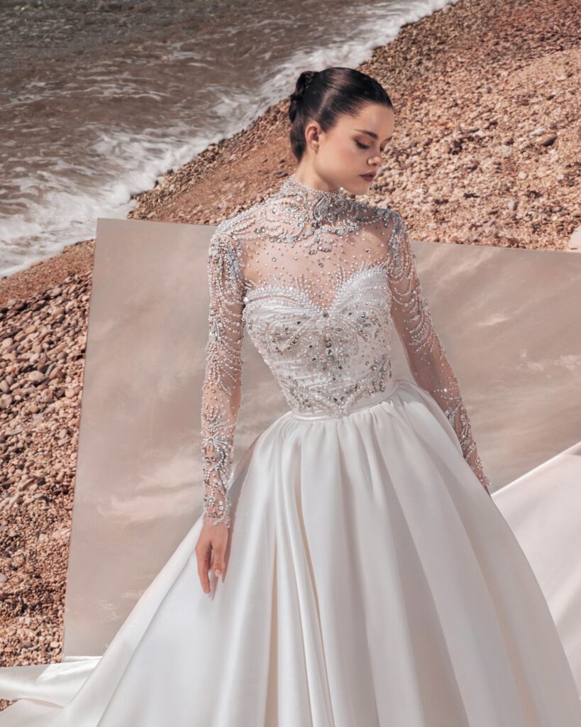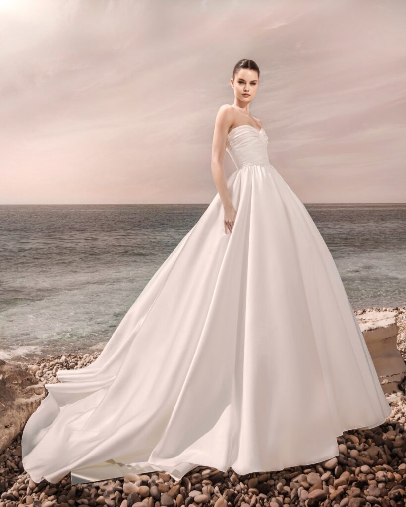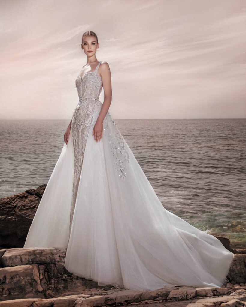 Anche in questa collezione sono presenti abiti da sposa scivolati e a sirena che, con l’aggiunta di una sopragonna, creano perfetti abiti da sposa componibili.