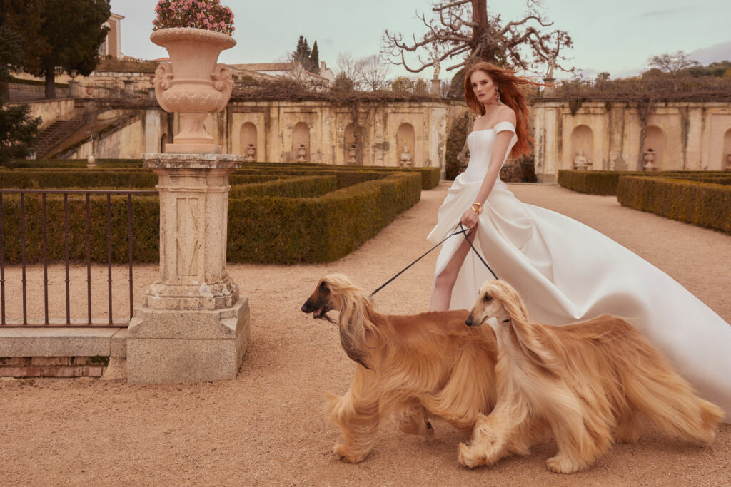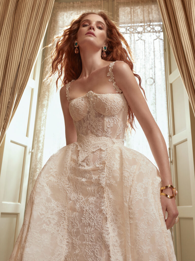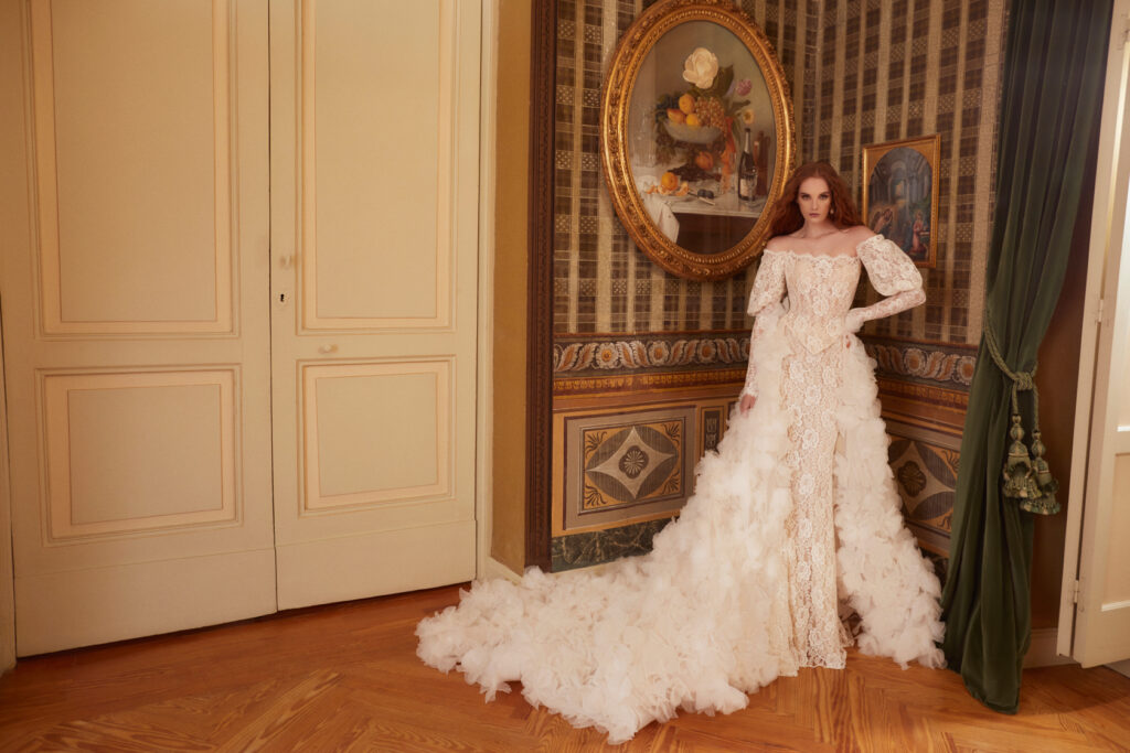 La collezione comprende anche abiti da sposa in diverse silhouette, con dettagli come il delicato pizzo francese vintage e le intricate applicazioni floreali.
