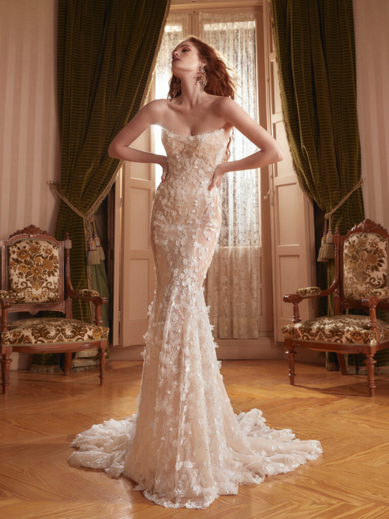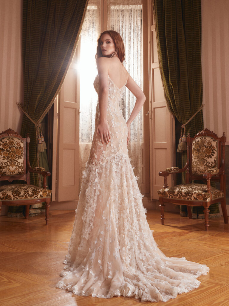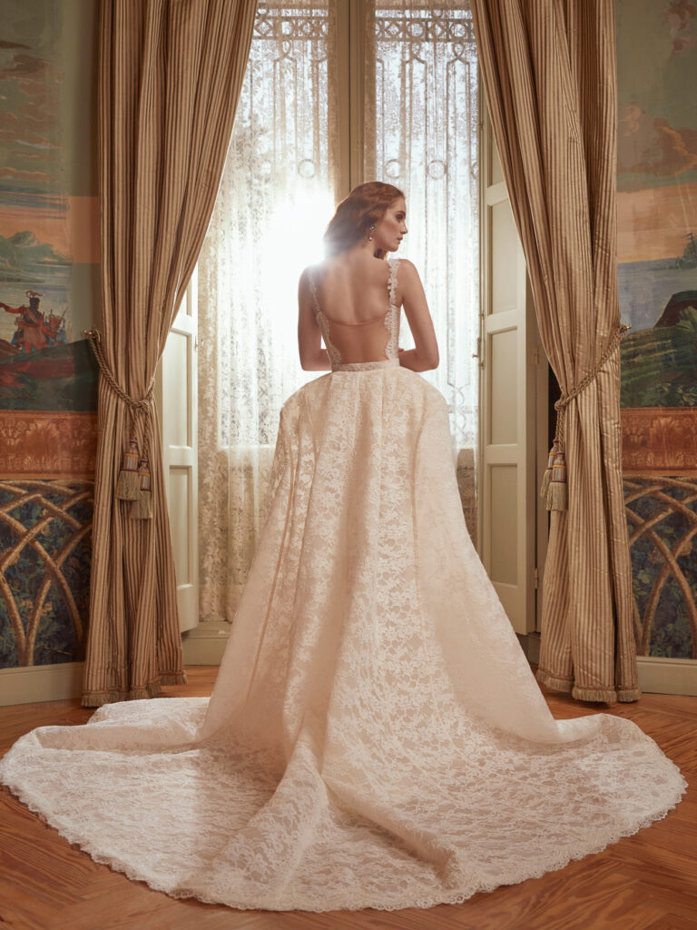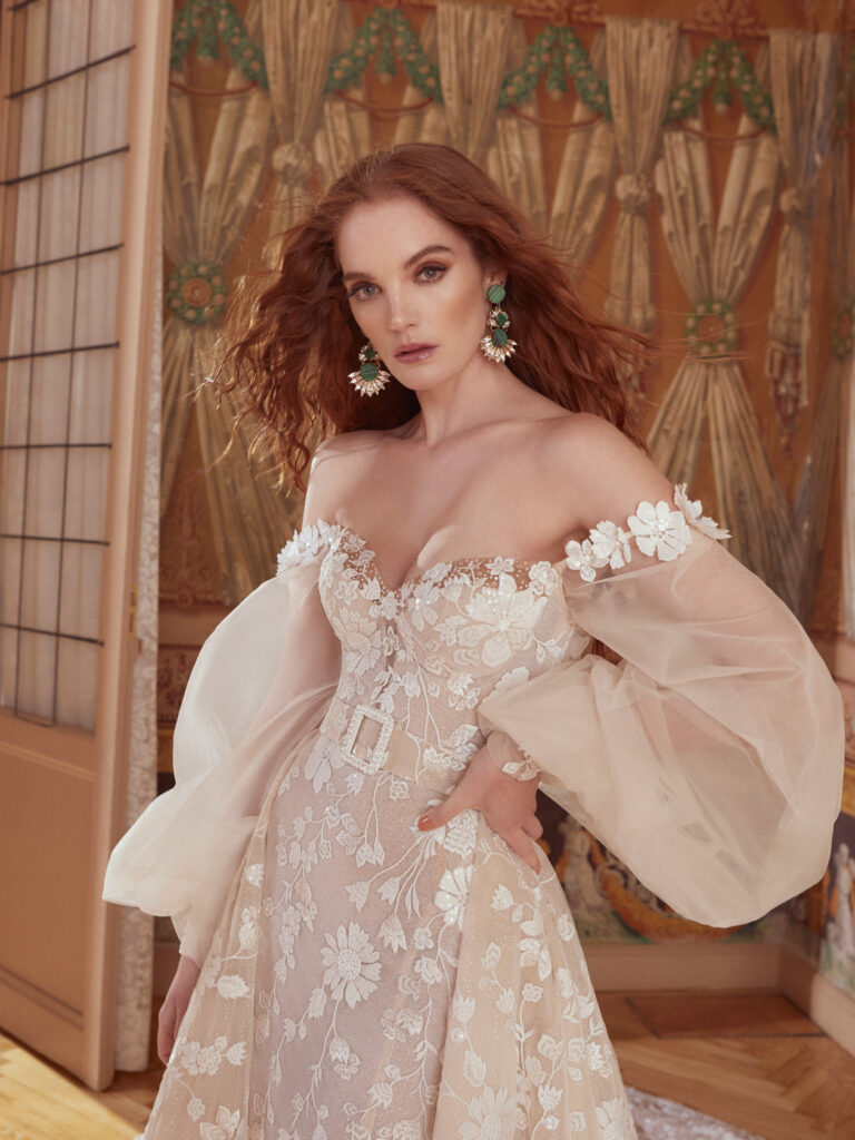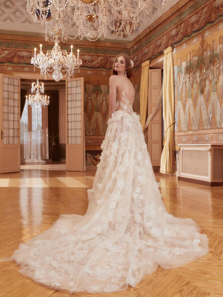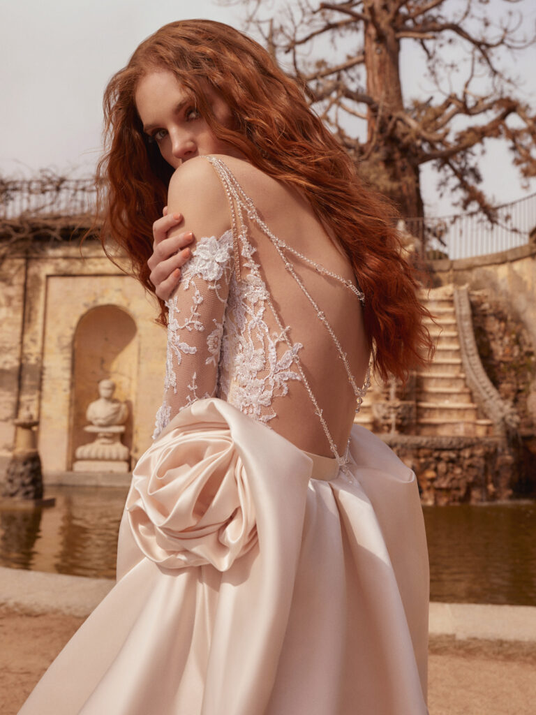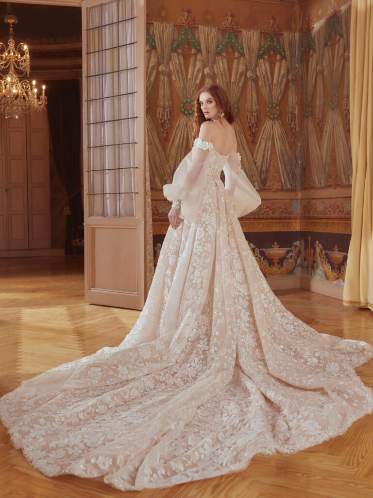 I tessuti preziosi come il pizzo e il mikado, le lavorazioni uniche come i tagli al laser e le applicazioni floreali 3D, le tonalità anche rosa cipria, la versatilità con le maniche rimovibili, i bolero, i coprispalle e le sopragonne, sono gli elementi “signature” della maison, che ritroviamo anche in questa collezione sposa.