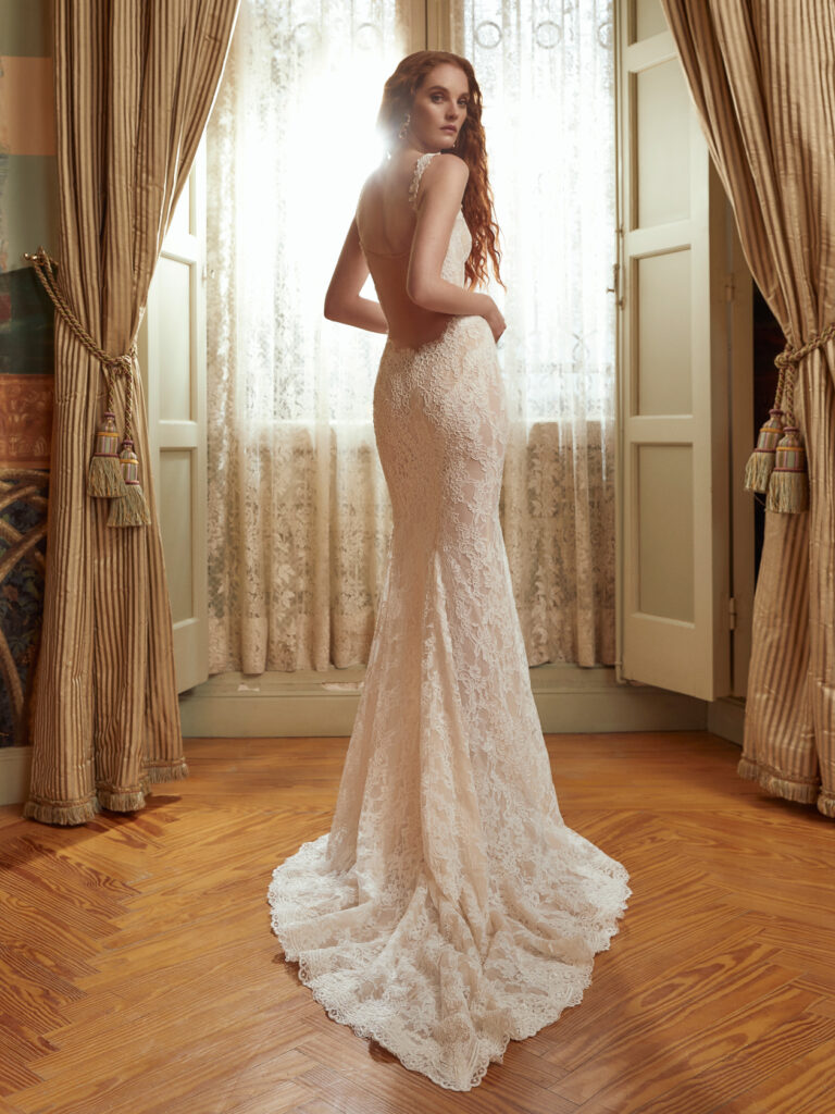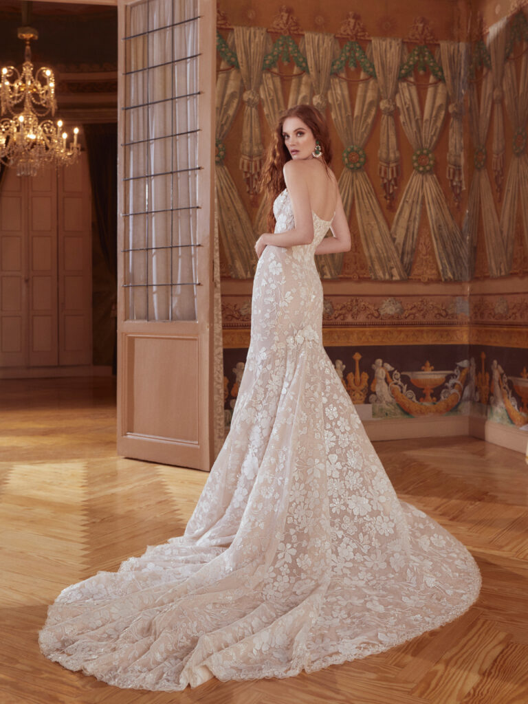 “Anais” è uno squisito abito a sirena in pizzo cordonato con un'audace schiena a corsetto trasparente. La scollatura ad ala d'angelo, le delicate spalline sottili e lo strascico a punta lo rendono davvero scenografico e, ancora di più, aggiungendo un'imponente sopragonna.