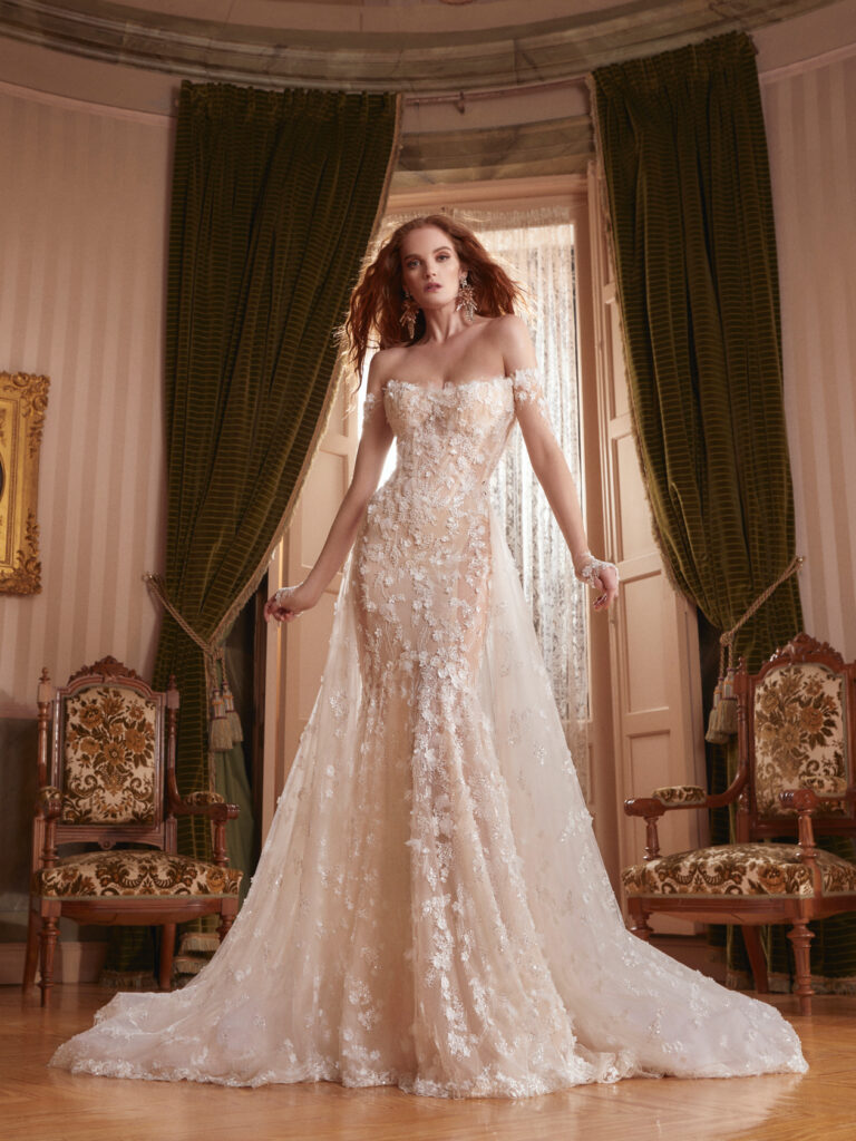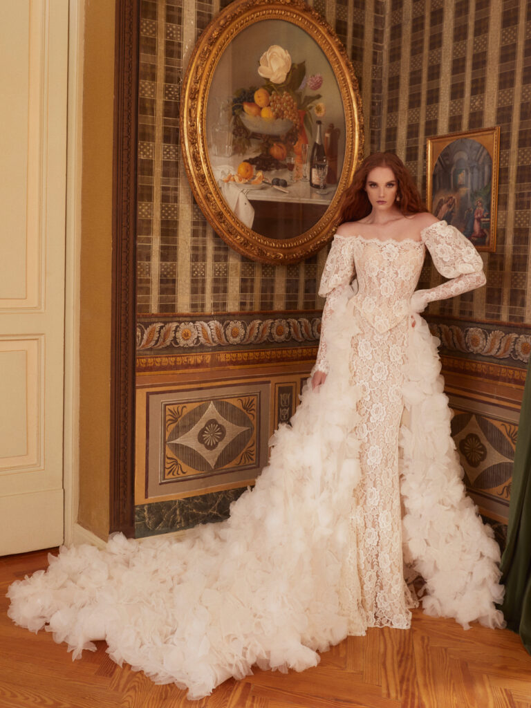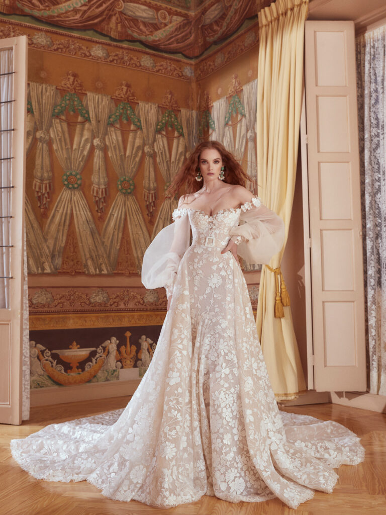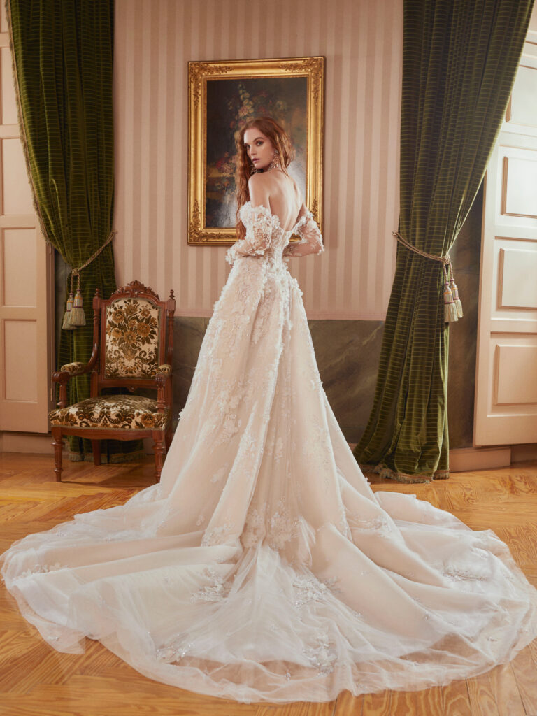 Con lo statuario abito da sposa a sirena “Finesse”, viene evocata l'eleganza vittoriana. L’abito è caratterizzato da un corsetto d'epoca allungato e sinuoso, con maniche gigot in pizzo francese off-the-shoulder aempo. Completa il look una scenografica sopragonna floreale che aggiunge il tocco perfetto di lussuosa eleganza. Abbracciate un fascino senza tempo con la gonna a sirena fluida in pizzo francese abbinata, ricoperta di applicazioni floreali fatte a mano.