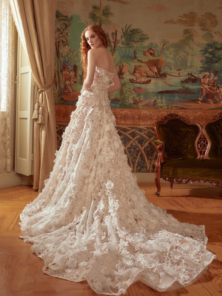 In chiusura, ricchissimo “Rosemary”, ball gown con top a corsetto trasparente, spalline delicate e scollatura quadrata ornata da un intricato pizzo 3D. L'orlo in crine e il top velato staccabile con applicazioni aggiungono un ulteriore livello di eleganza a questo indimenticabile ensemble da sposa, che culmina in uno strascico a punta per un finale regale.