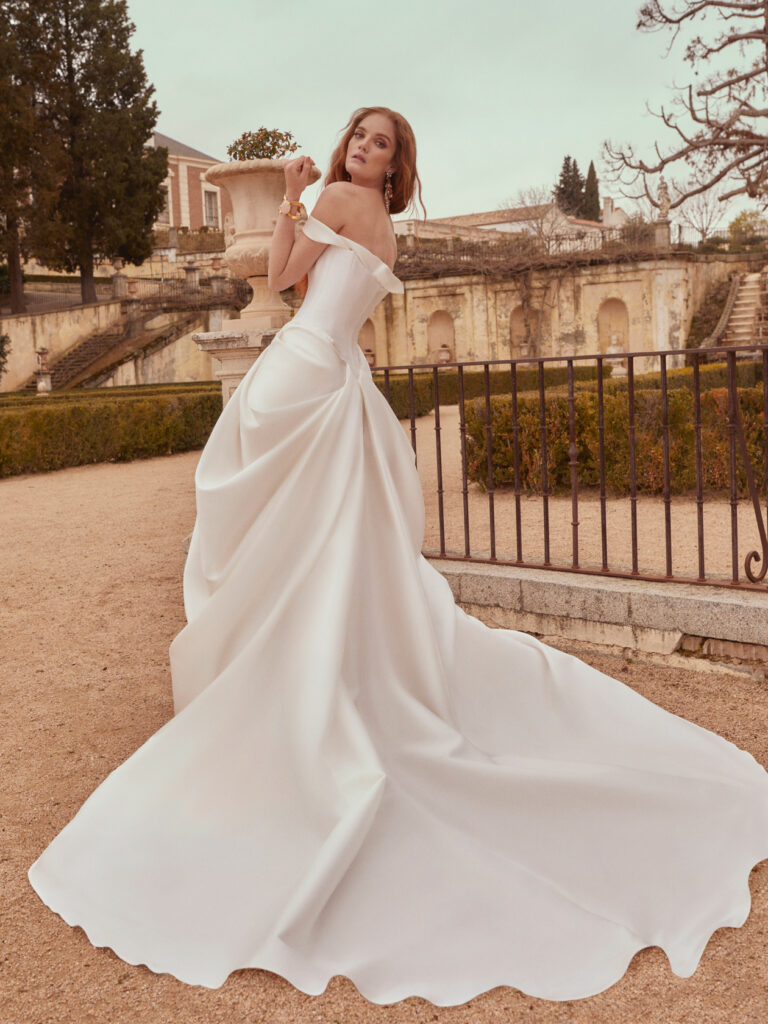Ancora per chi ama il movimento dei tessuti ed il romanticismo, ecco “Fresco”, abito da sposa in mikado di seta completamente drappeggiato a mano. Il corsetto vittoriano allungato e le spalline strutturate off-the-shoulder creano un elegante contrasto con la voluminosa gonna a volute, accentuata da un alto spacco laterale.