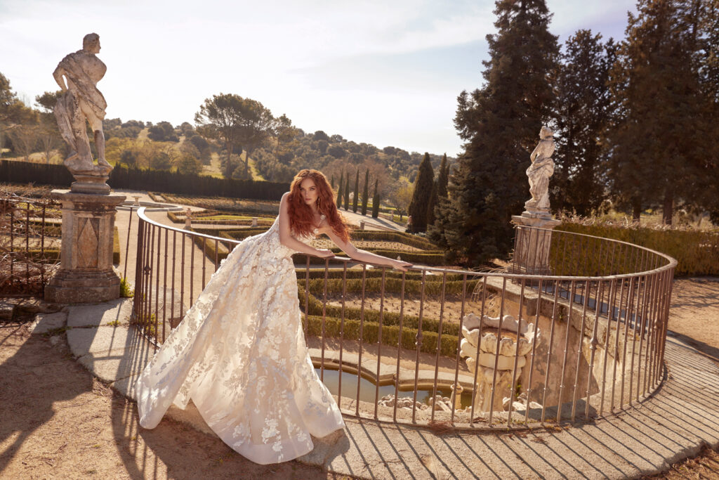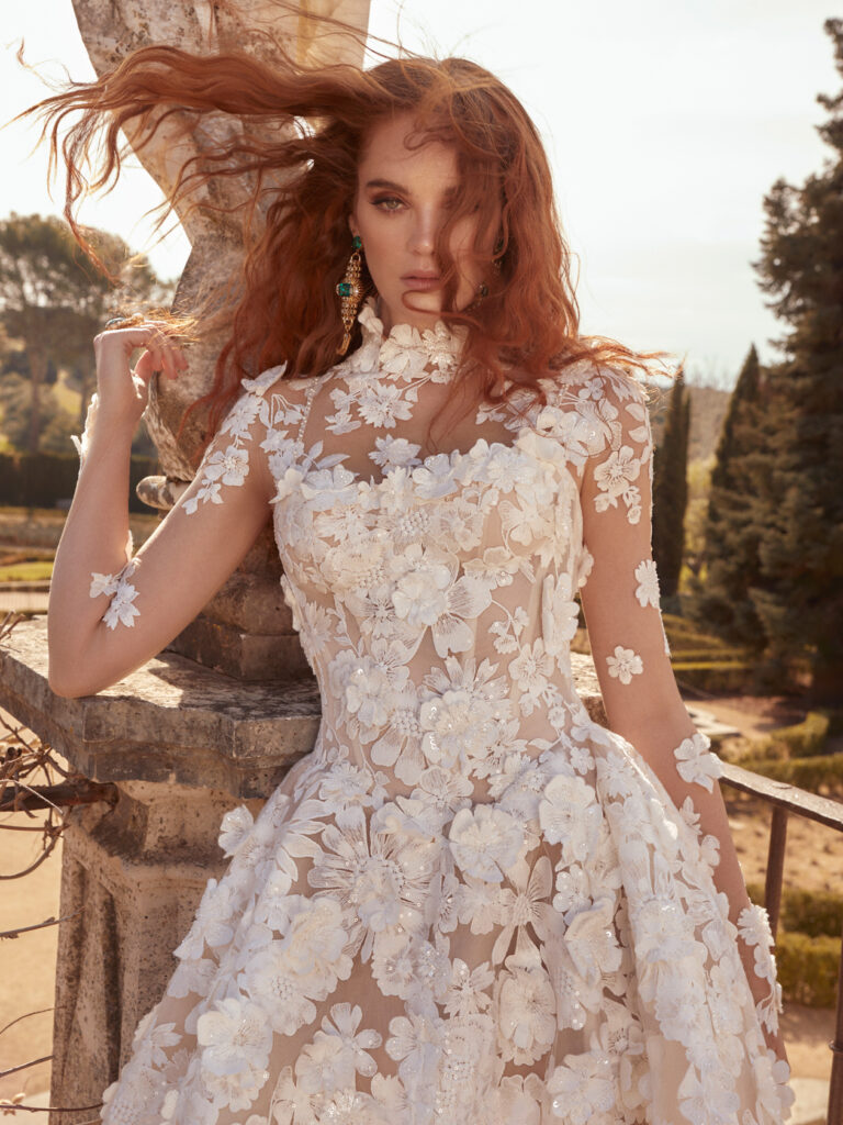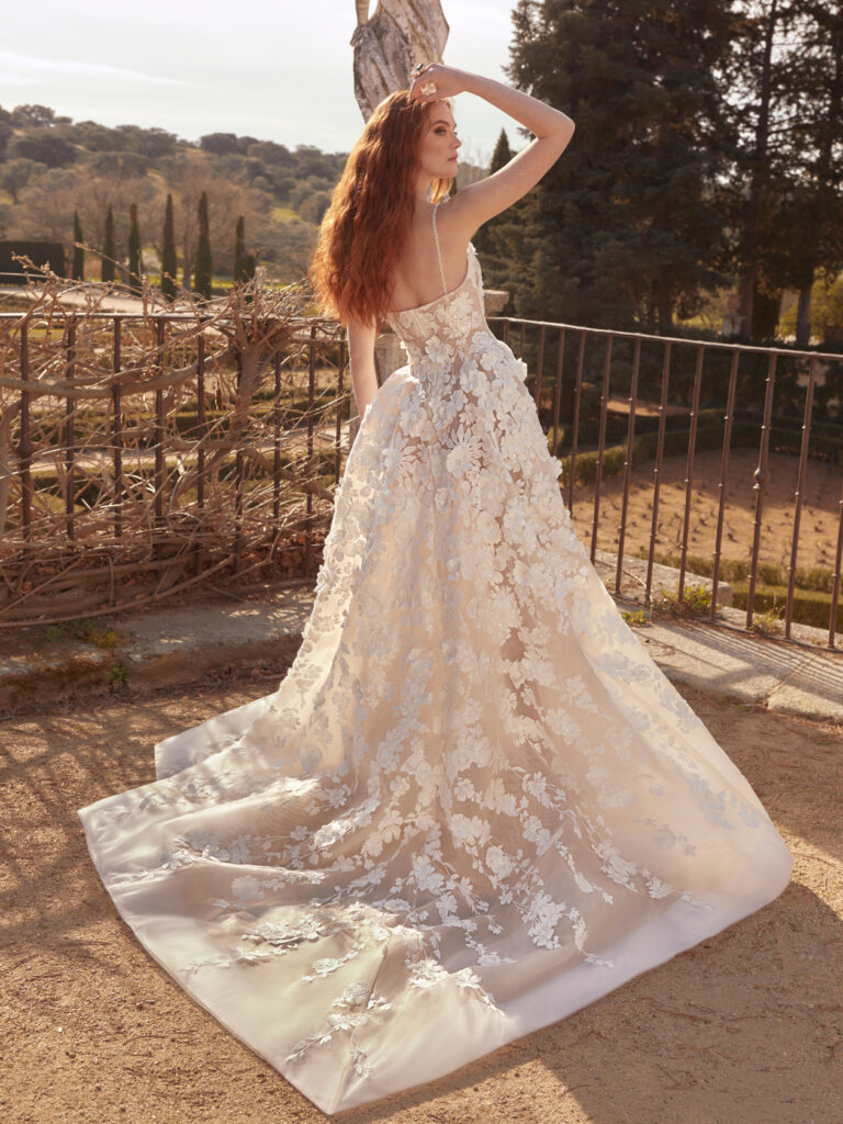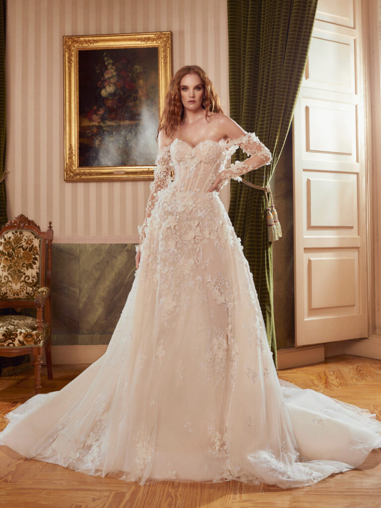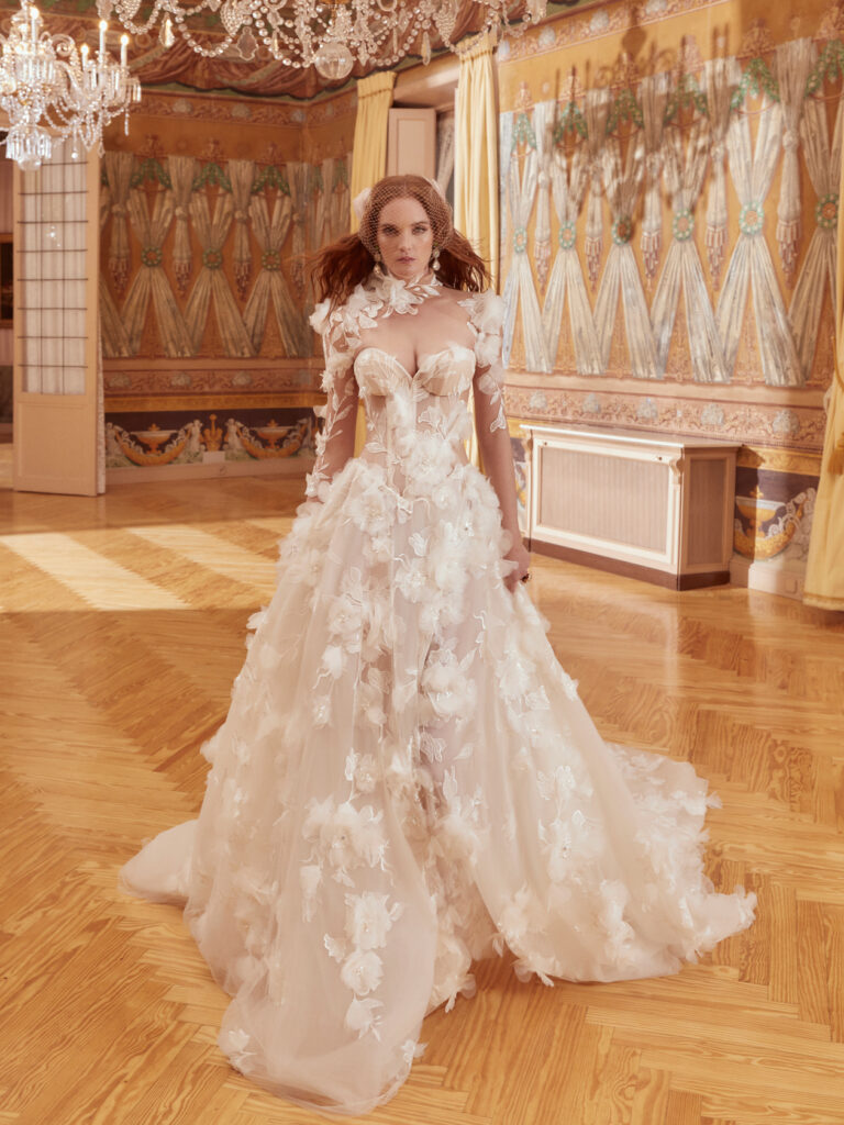 Per la sposa principessa, perfetto l’abito da ballo “Haeven”, caratterizzato da una scollatura a cuore e delicate spalline sottili. L'abito è interamente ricamato con infiniti cristalli, perline di vetro e fiori 3D, creando un campo floreale da sogno che scende lungo la gonna. L’abito può essere abbinato a una sopragonna regale e scenografica.