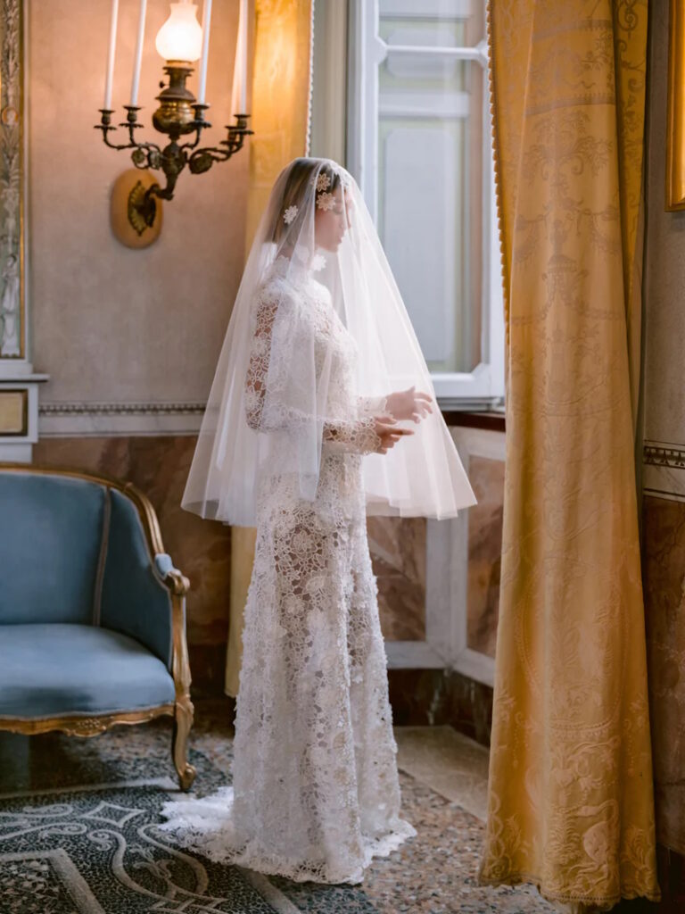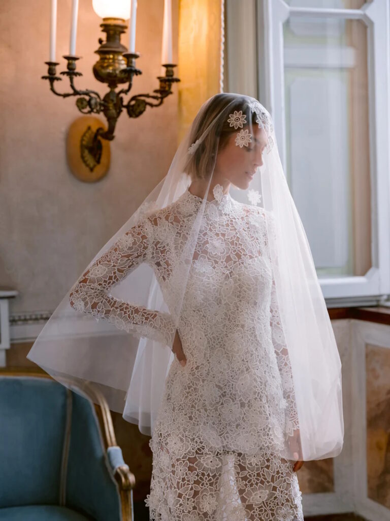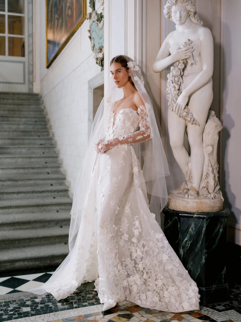 Strepitoso l’abito da sposa “Cipriani” con i suoi guanti: l’abito a colonna senza spalline in pizzo floreale tridimensionale con profondo scollo a cuore e strascico sopra la gonna è abbinato a guanti da opera in pizzo floreale coordinati e ad un velo coordinato a doppio pettine con ricami sparsi in pizzo floreale, “un’ode all'eleganza italiana” secondo la maison.