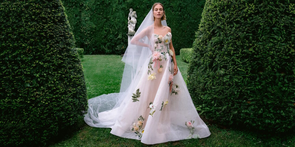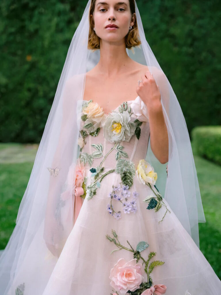 Cominciamo ammirando gli strepitosi abiti da sposa colorati impreziositi da fiori 3D, dettaglio signature della maison e tema ricorrente delle collezioni sposa Monique Lhuillier.