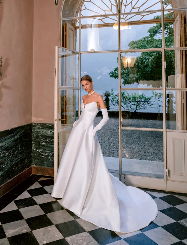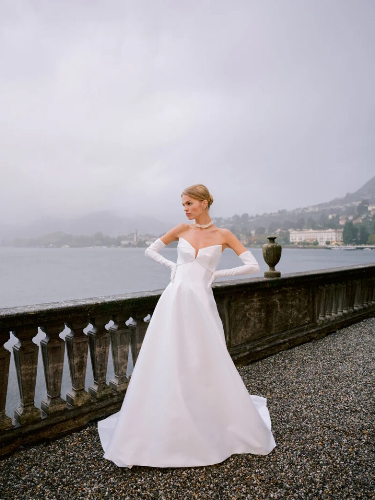 Da vera principessa anche l’abito da sposa “Milan”, realizzato in Mikado, senza spalline, con scollo a intaglio drappeggiato.
