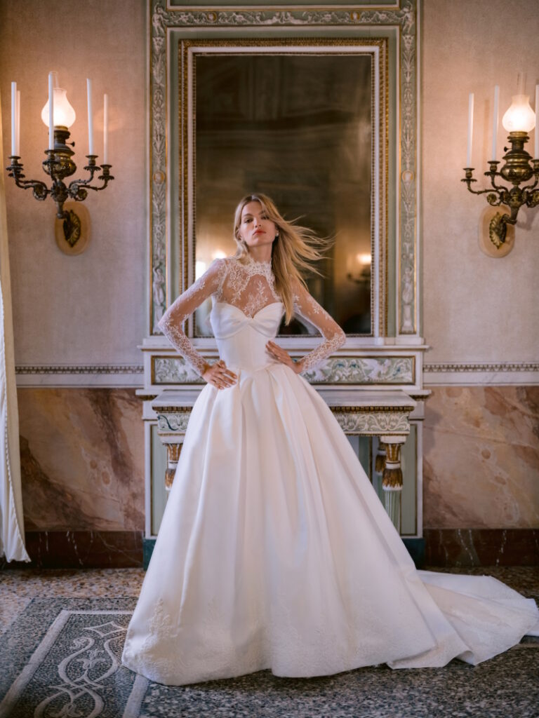 Un sogno romantico è “Ravello”, abito da sposa principesco drappeggiato e senza spalline in Piqué Gazar floreale con gonna a balze, proposto in abbinamento a un velo a due livelli coordinato con ricami a farfalla sparsi.