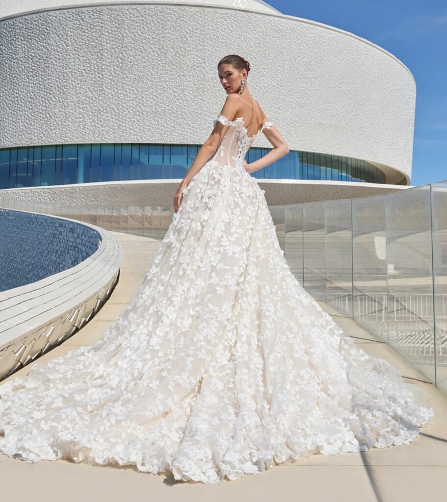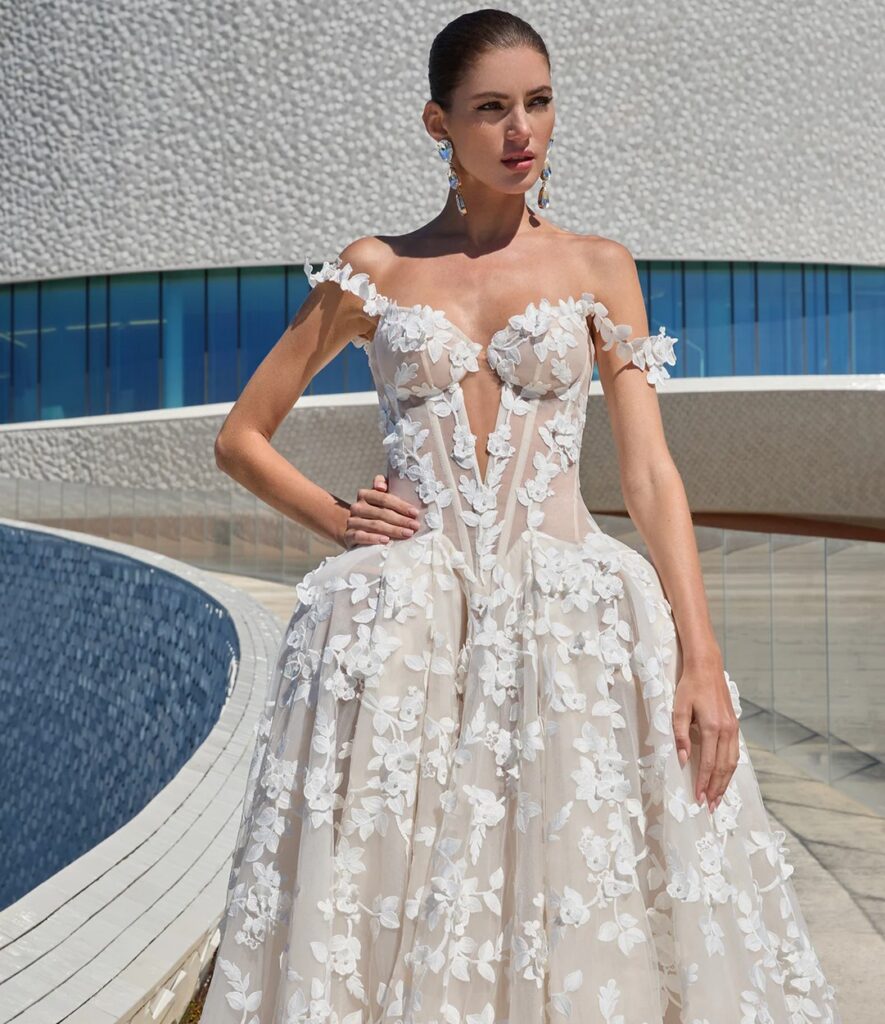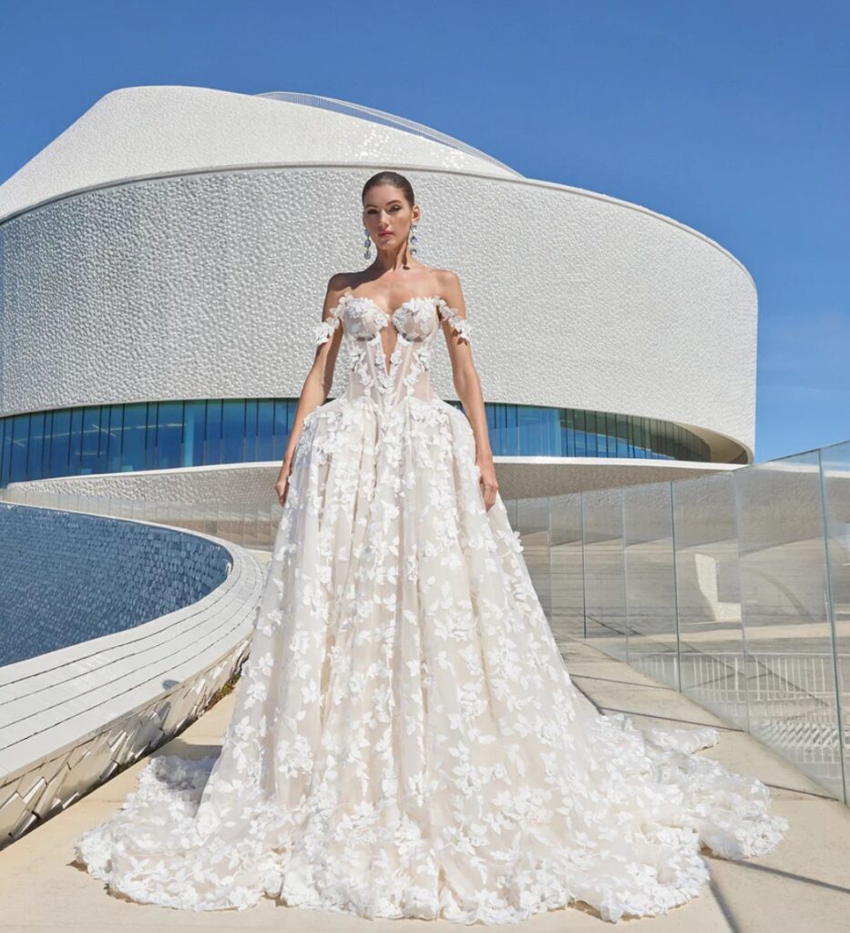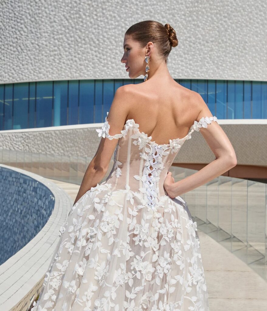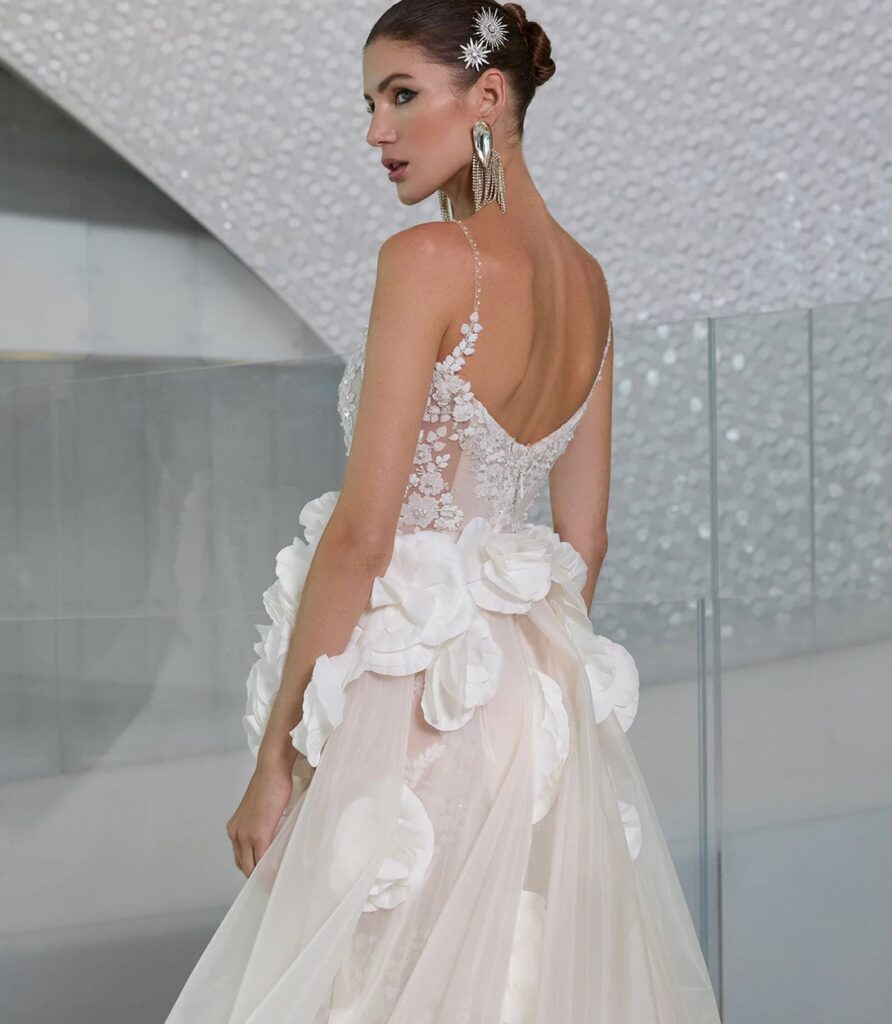 Davvero incantevole “Petal”, abito da sposa a tema floreale caratterizzato da dettagli in corsetto trasparente e delicate applicazioni in pizzo. “L'esclusivo punto vita a forma di stella mette in risalto la silhouette – spiega la maison - mentre le spalline off-the-shoulder aggiungono un tocco romantico, rendendo questo abito un perfetto connubio di eleganza e stravaganza”.