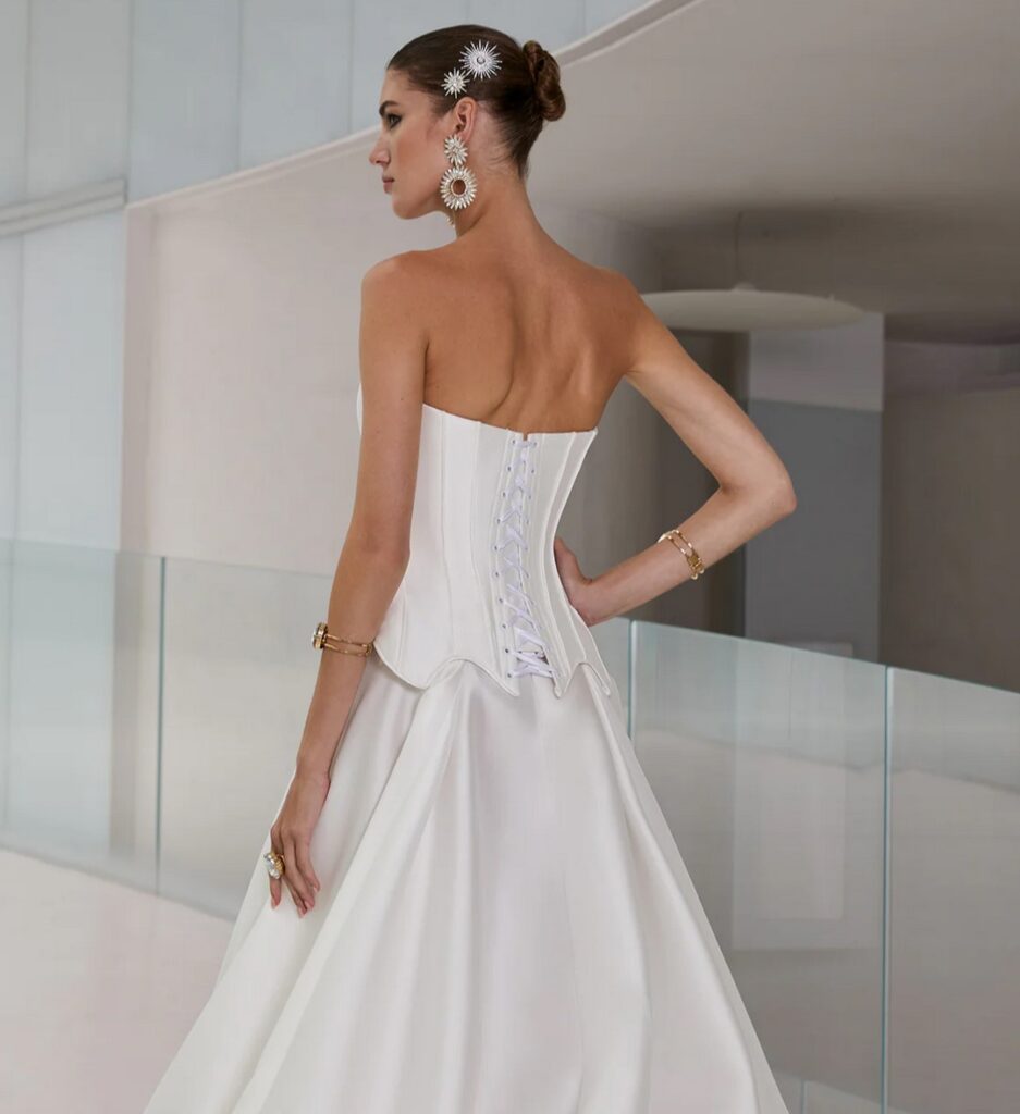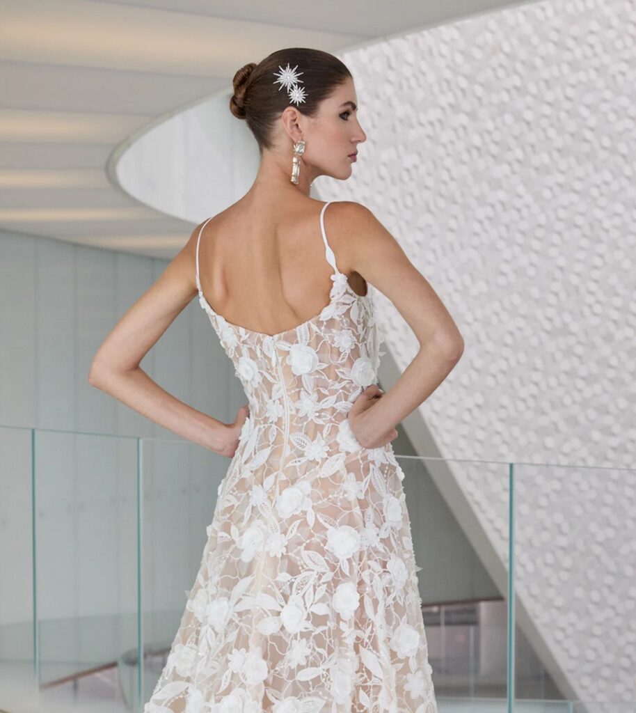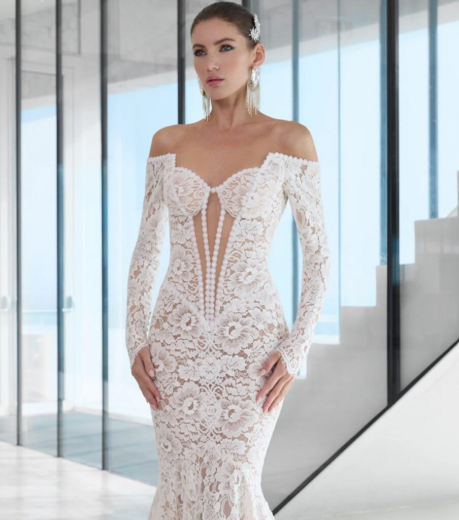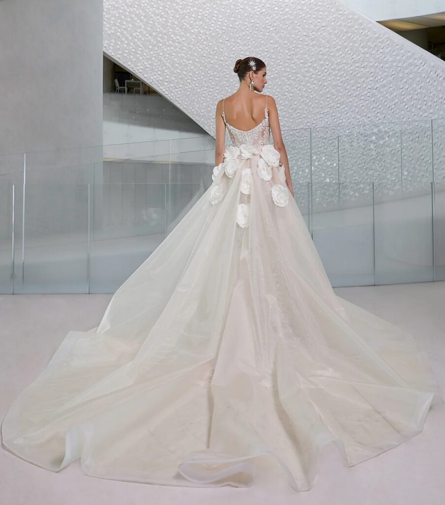 Davvero incantevole “Petal”, abito da sposa a tema floreale caratterizzato da dettagli in corsetto trasparente e delicate applicazioni in pizzo. “L'esclusivo punto vita a forma di stella mette in risalto la silhouette – spiega la maison - mentre le spalline off-the-shoulder aggiungono un tocco romantico, rendendo questo abito un perfetto connubio di eleganza e stravaganza”.