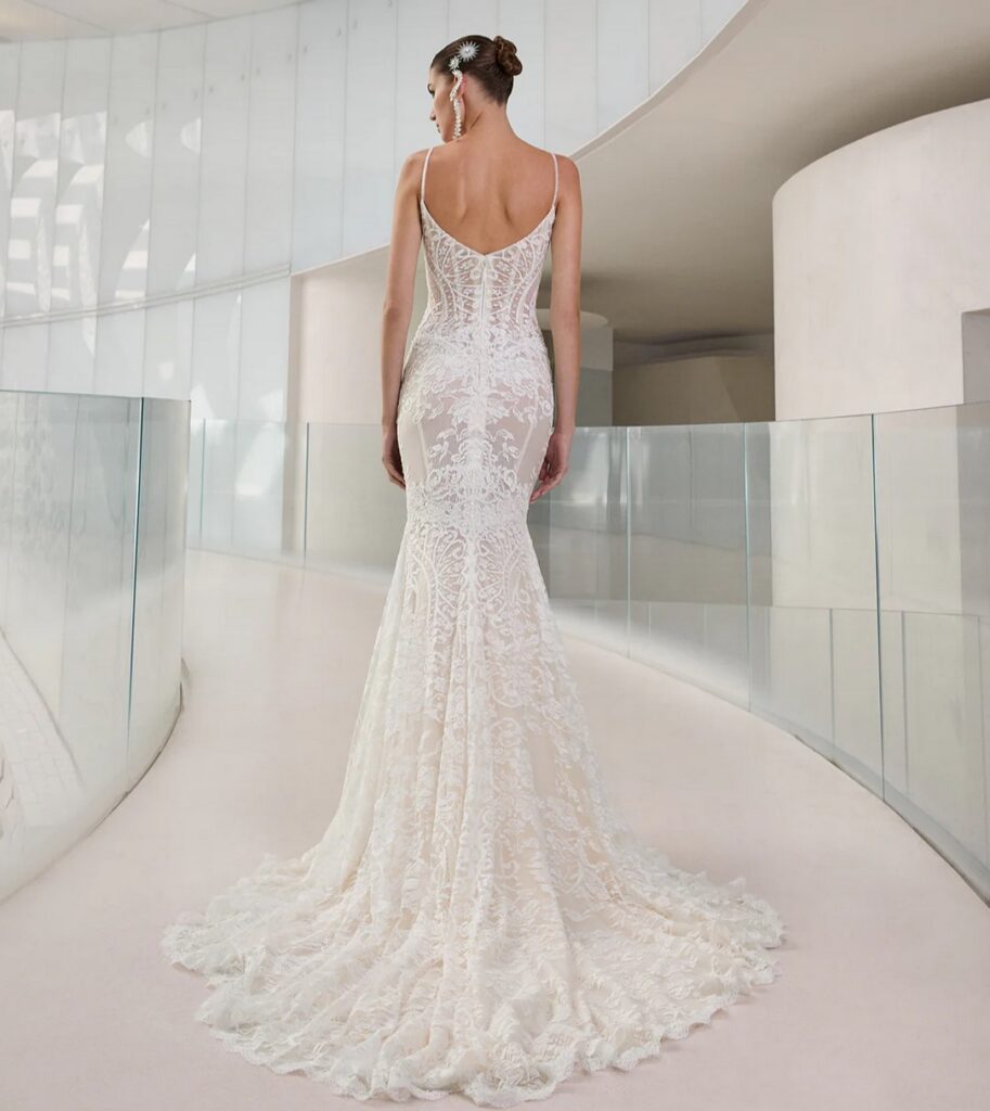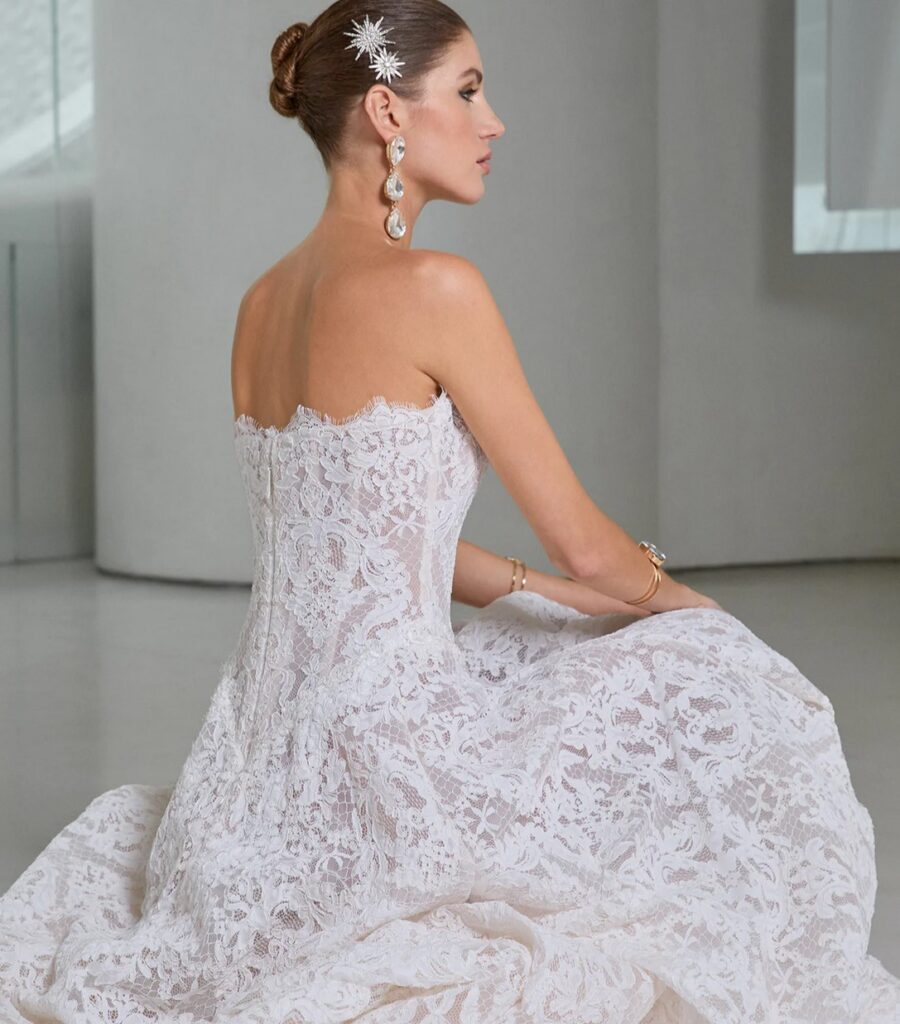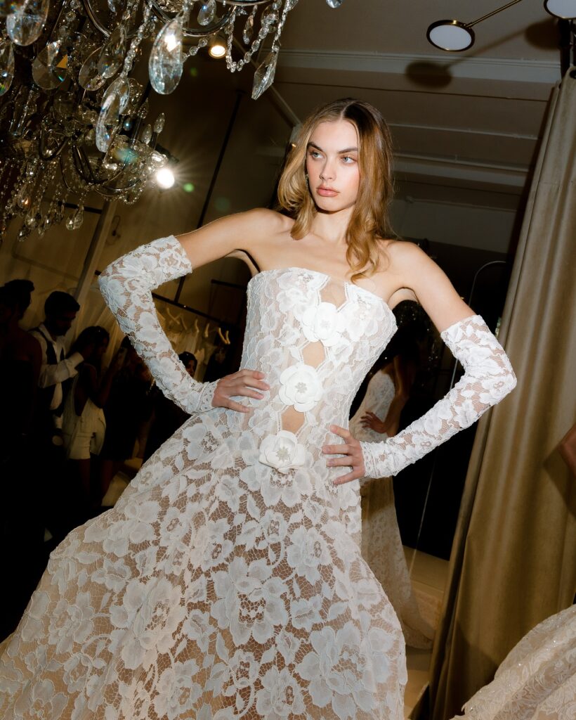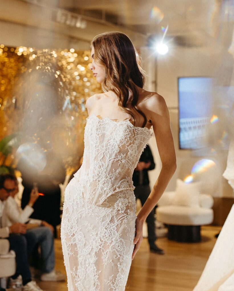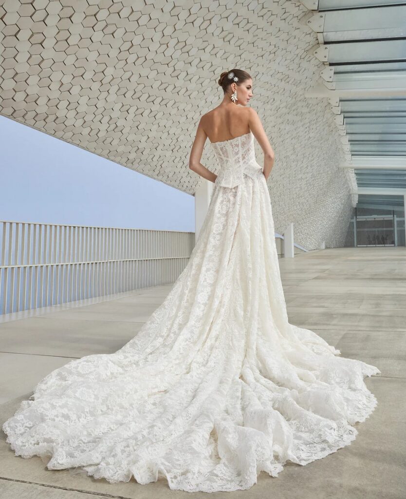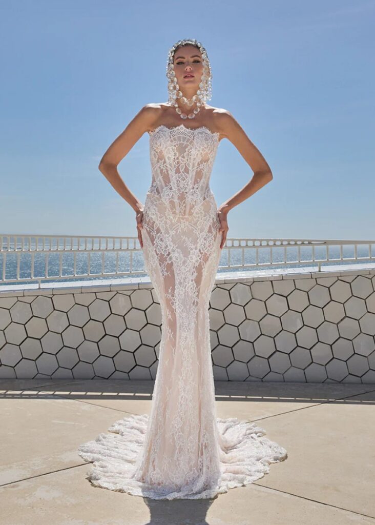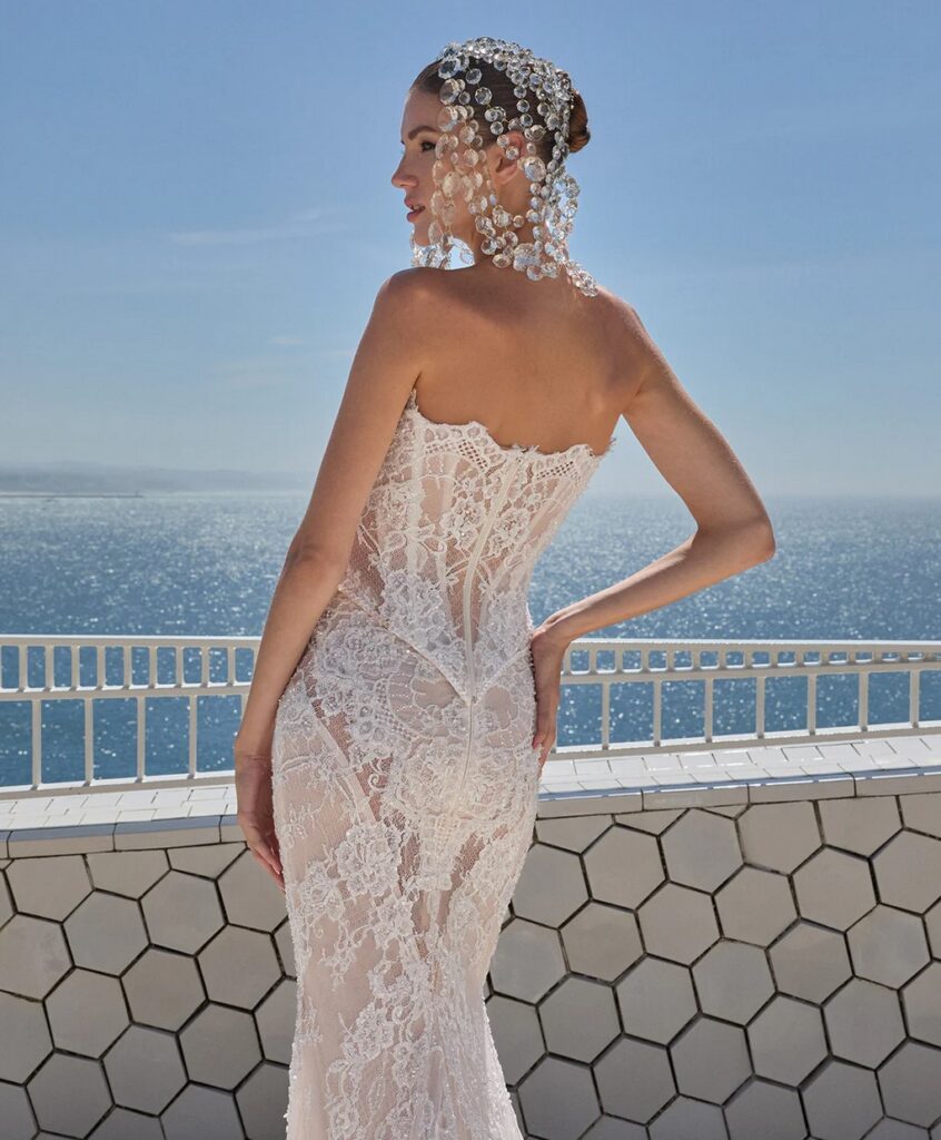 Super glam e dalla linea mozzafiato “Evangeline”, statuario ensemble a due pezzi con un corsetto senza spalline a più pannelli in stile barocco abbinato a una gonna a sirena allungata. Entrambi i capi sono realizzati in opulento pizzo francese ricamato “creando una silhouette lussuosa e sorprendente che emana eleganza e grandezza senza tempo”, spiega la maison.