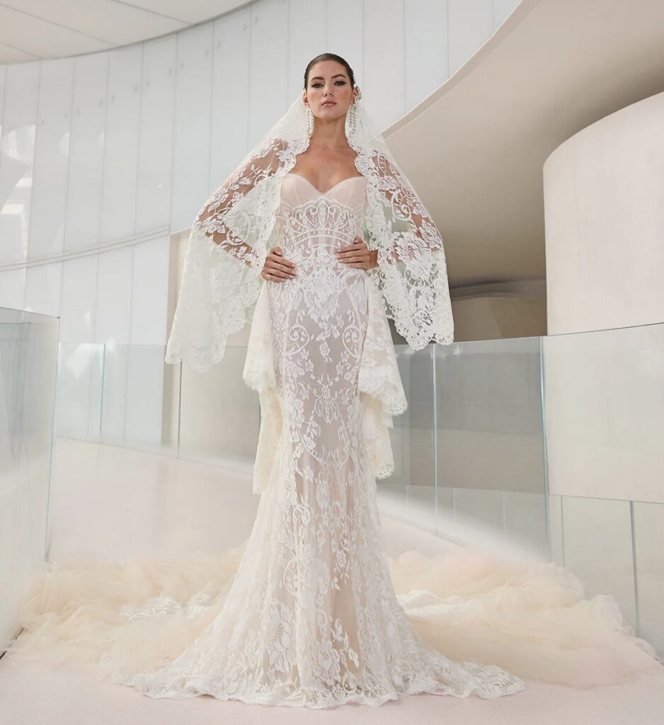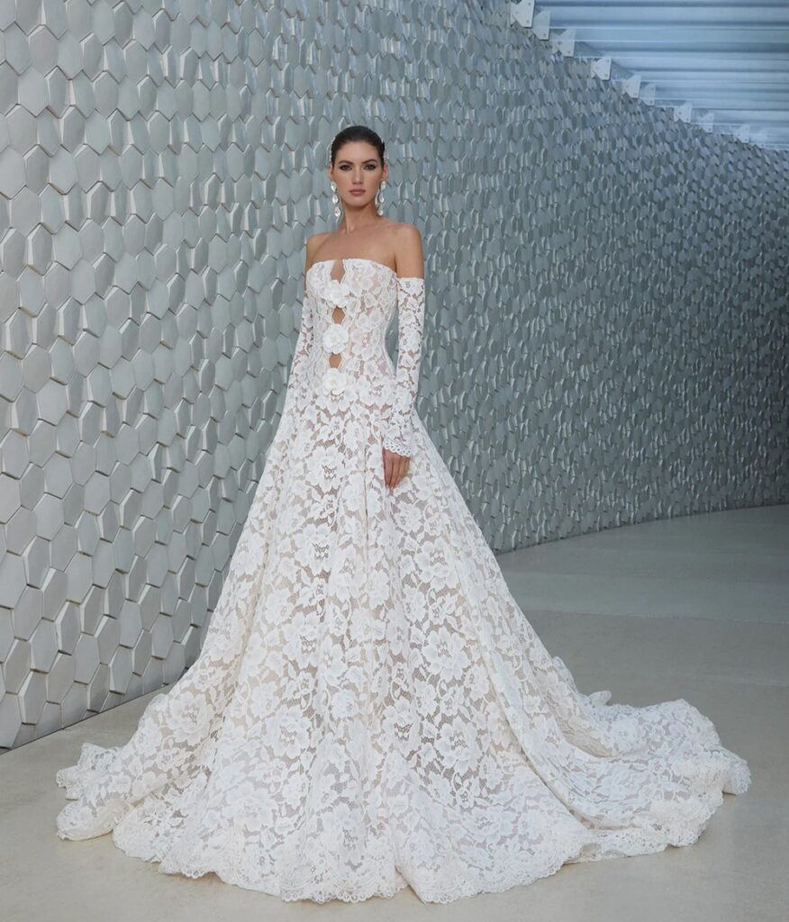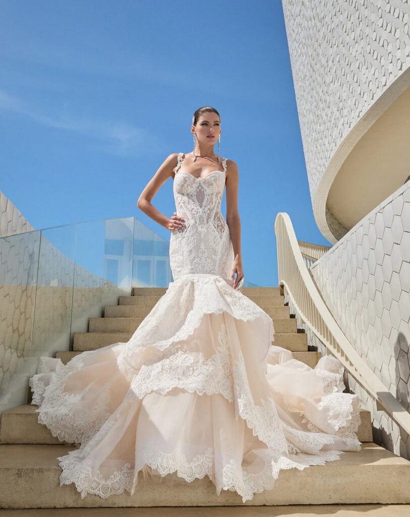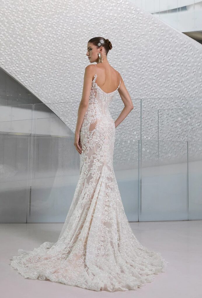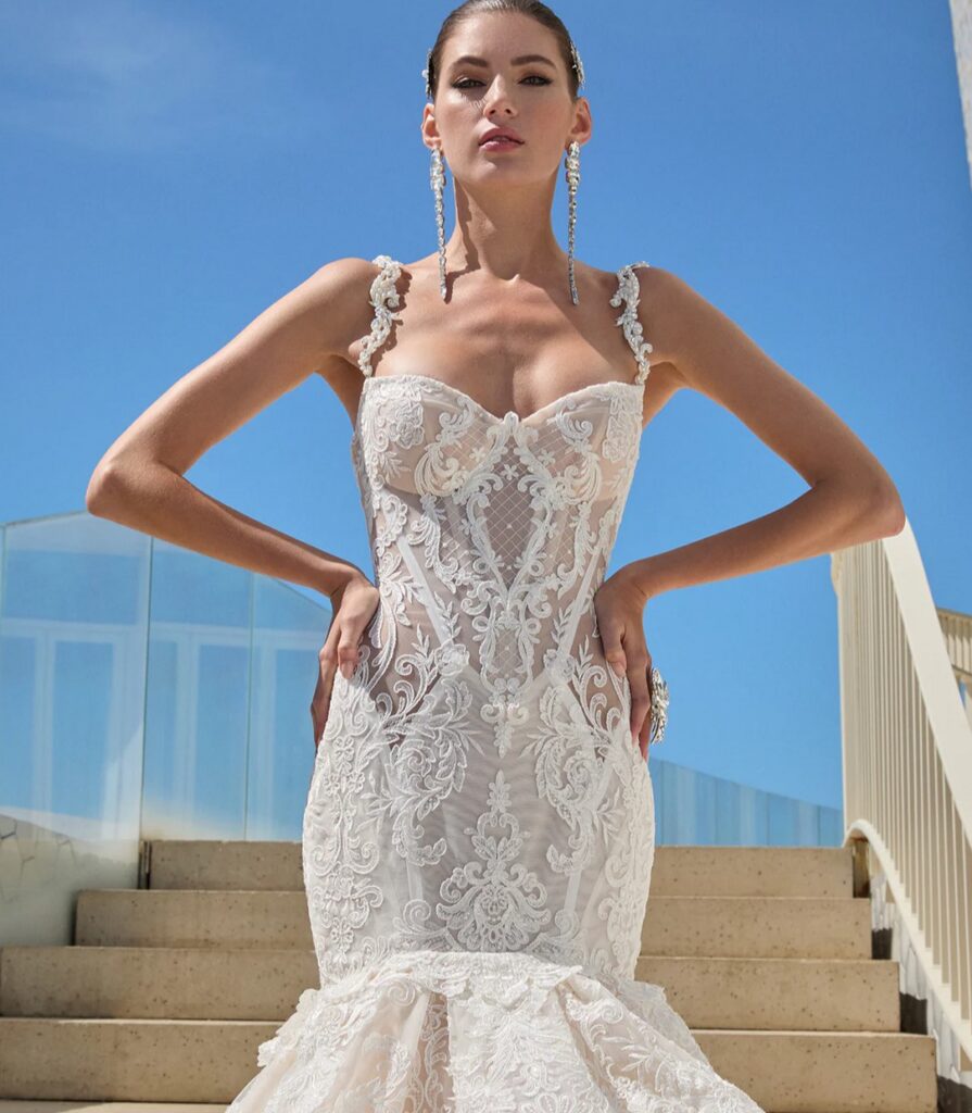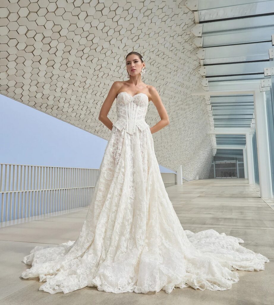 Super glam e dalla linea mozzafiato “Evangeline”, statuario ensemble a due pezzi con un corsetto senza spalline a più pannelli in stile barocco abbinato a una gonna a sirena allungata. Entrambi i capi sono realizzati in opulento pizzo francese ricamato “creando una silhouette lussuosa e sorprendente che emana eleganza e grandezza senza tempo”, spiega la maison.
