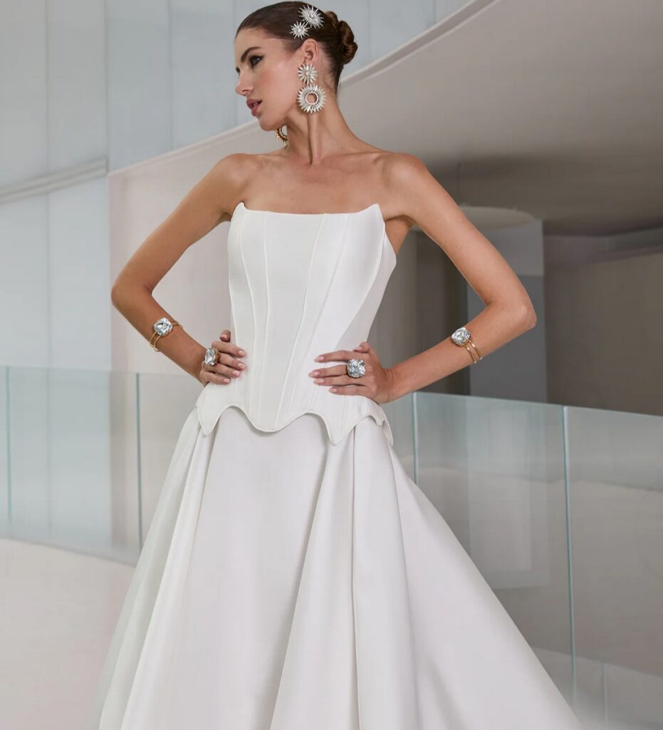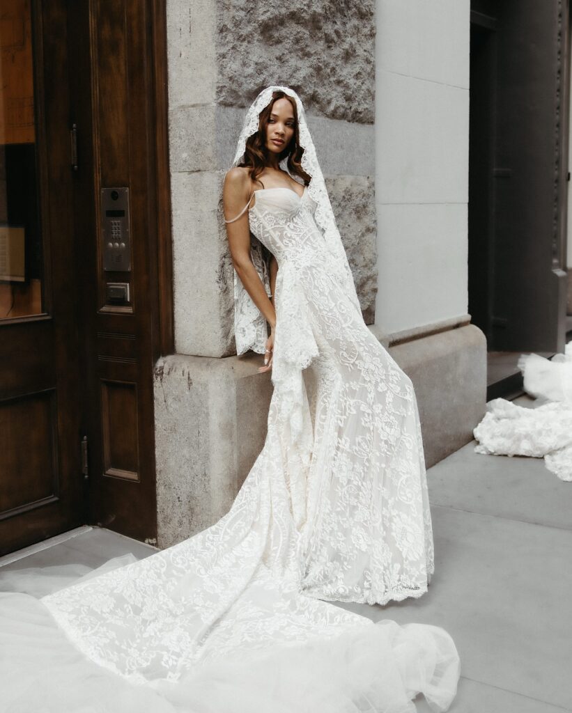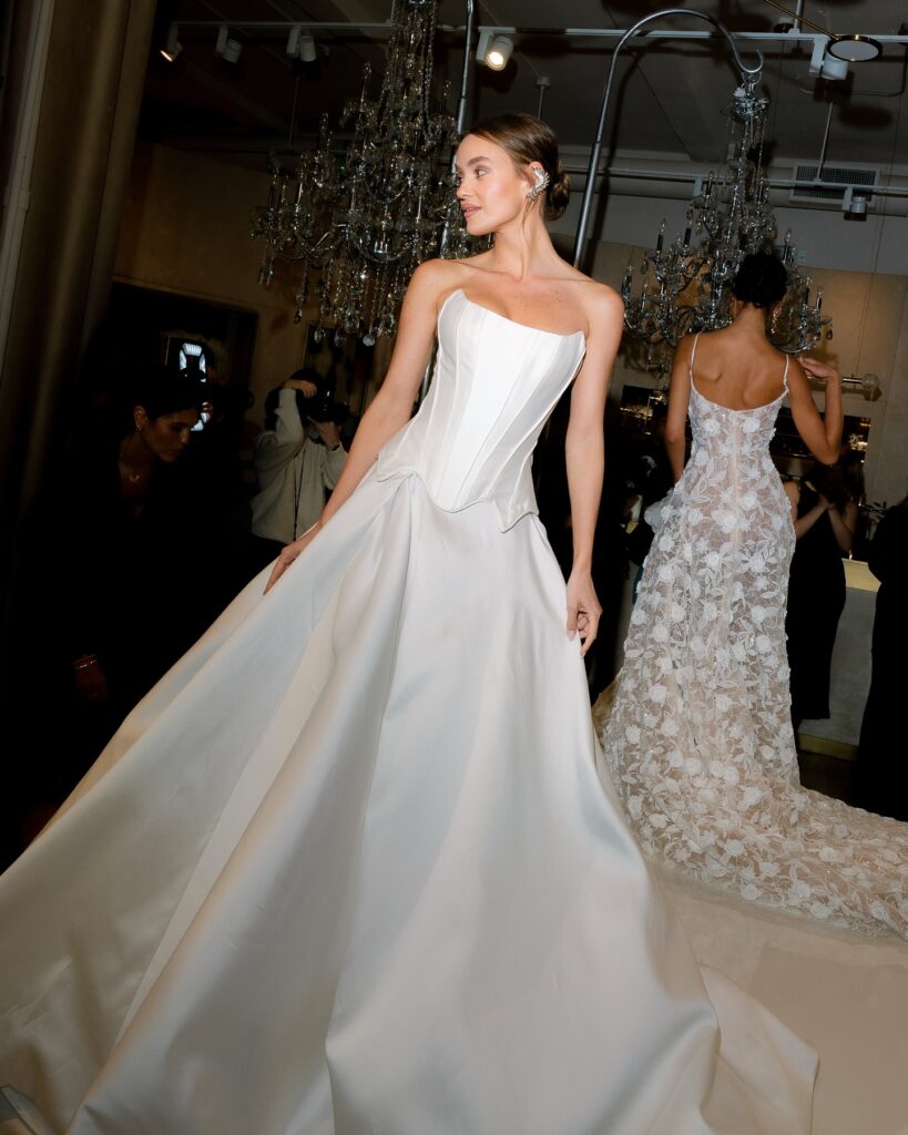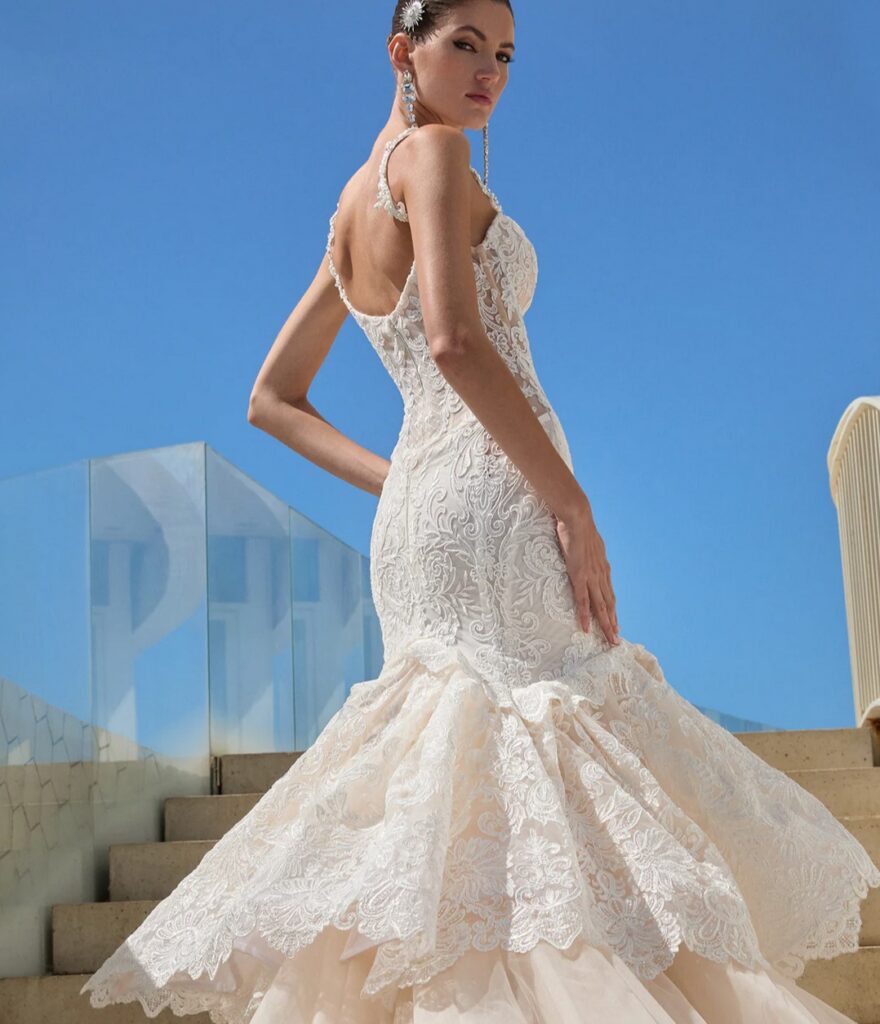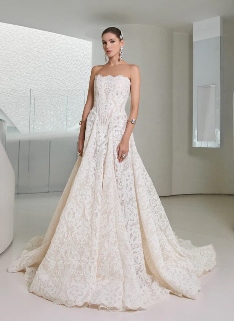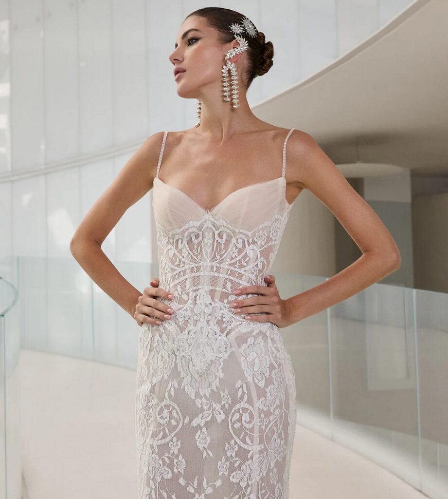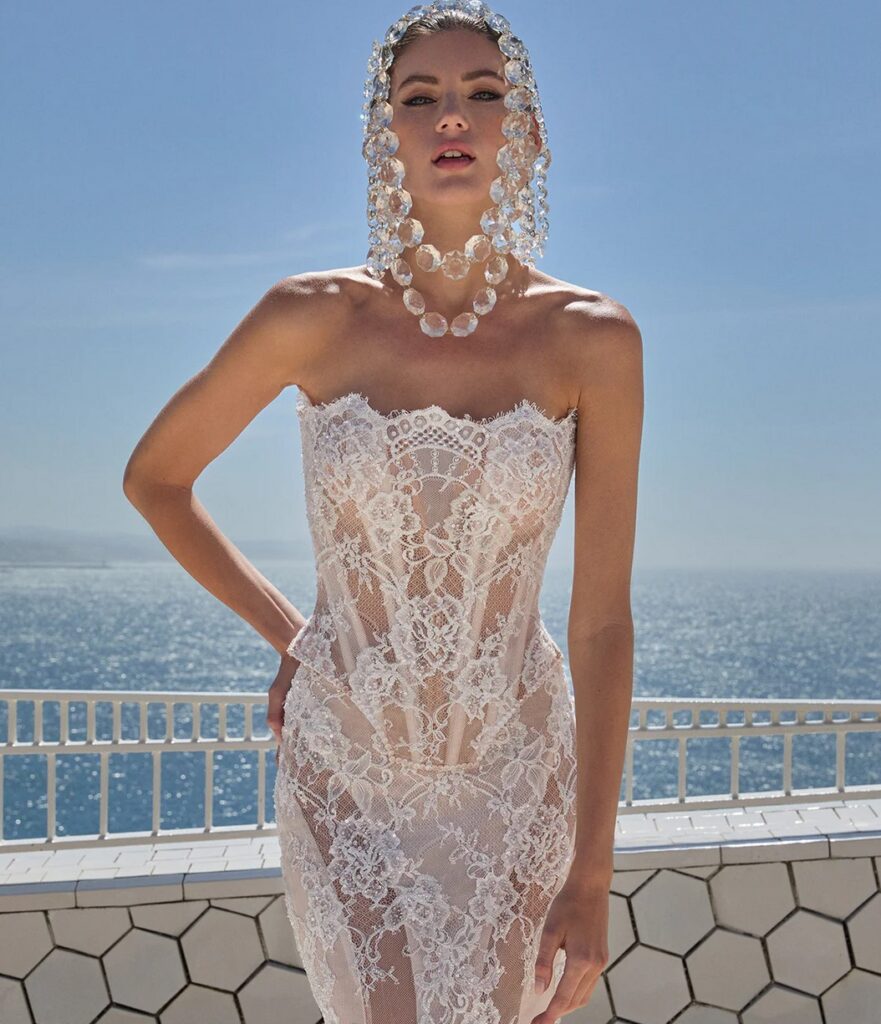 Super glam e dalla linea mozzafiato “Evangeline”, statuario ensemble a due pezzi con un corsetto senza spalline a più pannelli in stile barocco abbinato a una gonna a sirena allungata. Entrambi i capi sono realizzati in opulento pizzo francese ricamato “creando una silhouette lussuosa e sorprendente che emana eleganza e grandezza senza tempo”, spiega la maison.