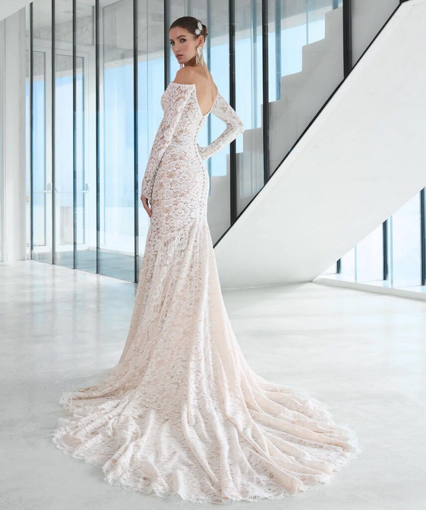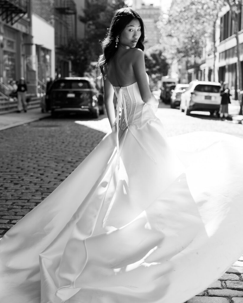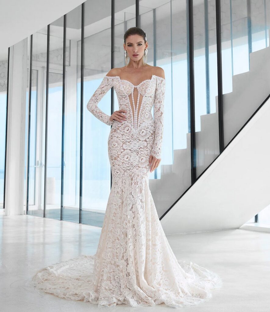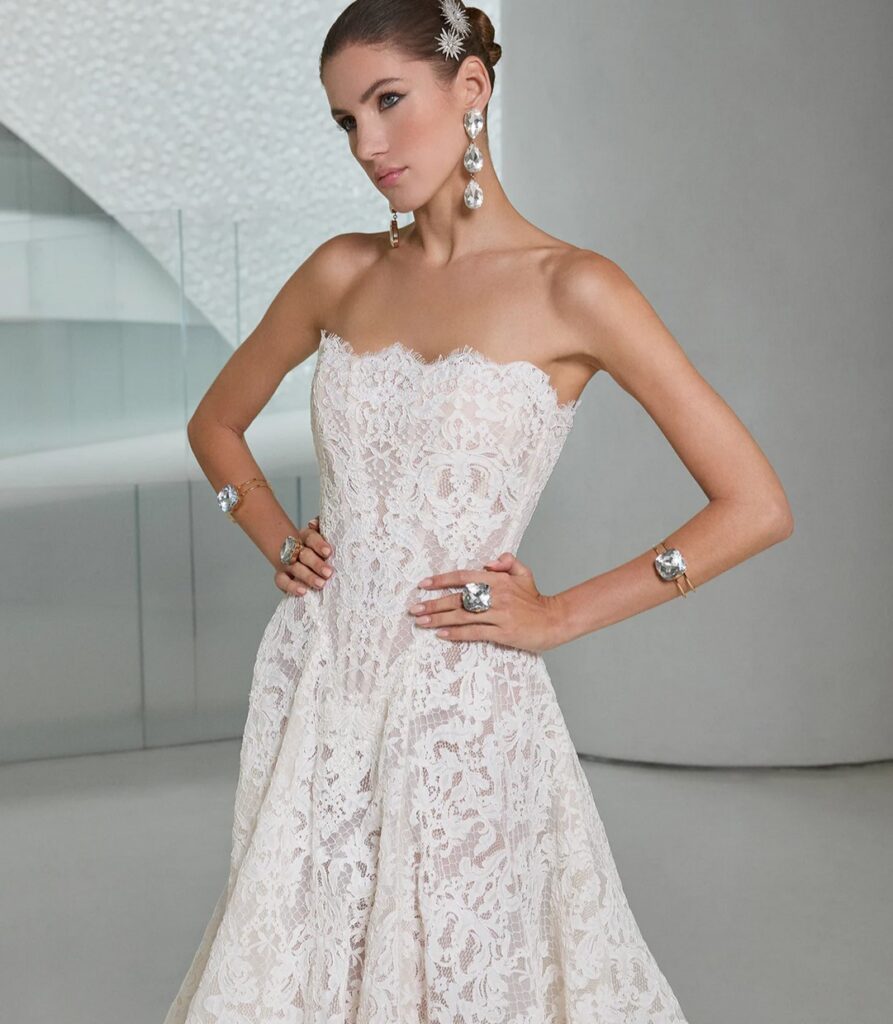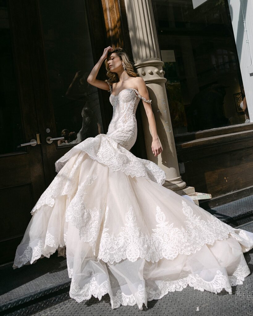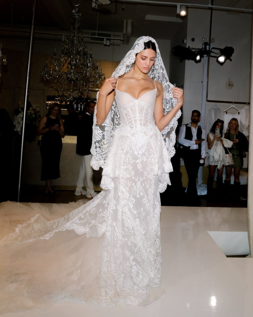 Super glam e dalla linea mozzafiato “Evangeline”, statuario ensemble a due pezzi con un corsetto senza spalline a più pannelli in stile barocco abbinato a una gonna a sirena allungata. Entrambi i capi sono realizzati in opulento pizzo francese ricamato “creando una silhouette lussuosa e sorprendente che emana eleganza e grandezza senza tempo”, spiega la maison.