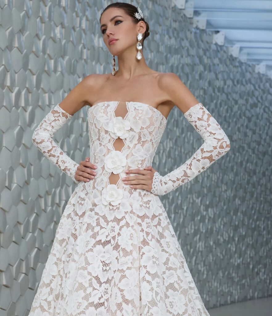 Trionfo di pizzo per l’originale abito “Contessa”, un modello sontuoso con corsetto a vita bassa caratterizzato da un audace scollatura ornata da fiori di perline di seta fatti a mano e abbinato a maniche rimovibili. L'abito è realizzato in pizzo francese oversize e “offre una silhouette audace e romantica che trasuda lusso moderno”, spiega la maison.