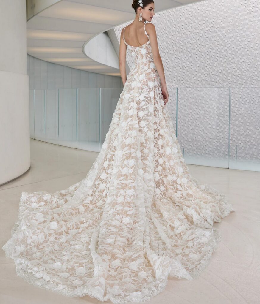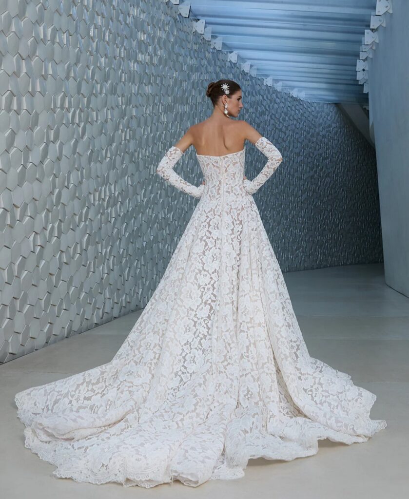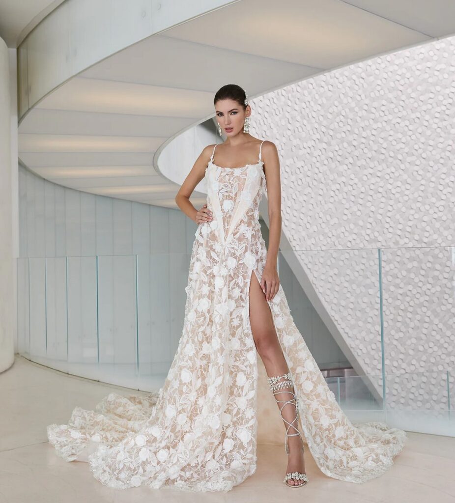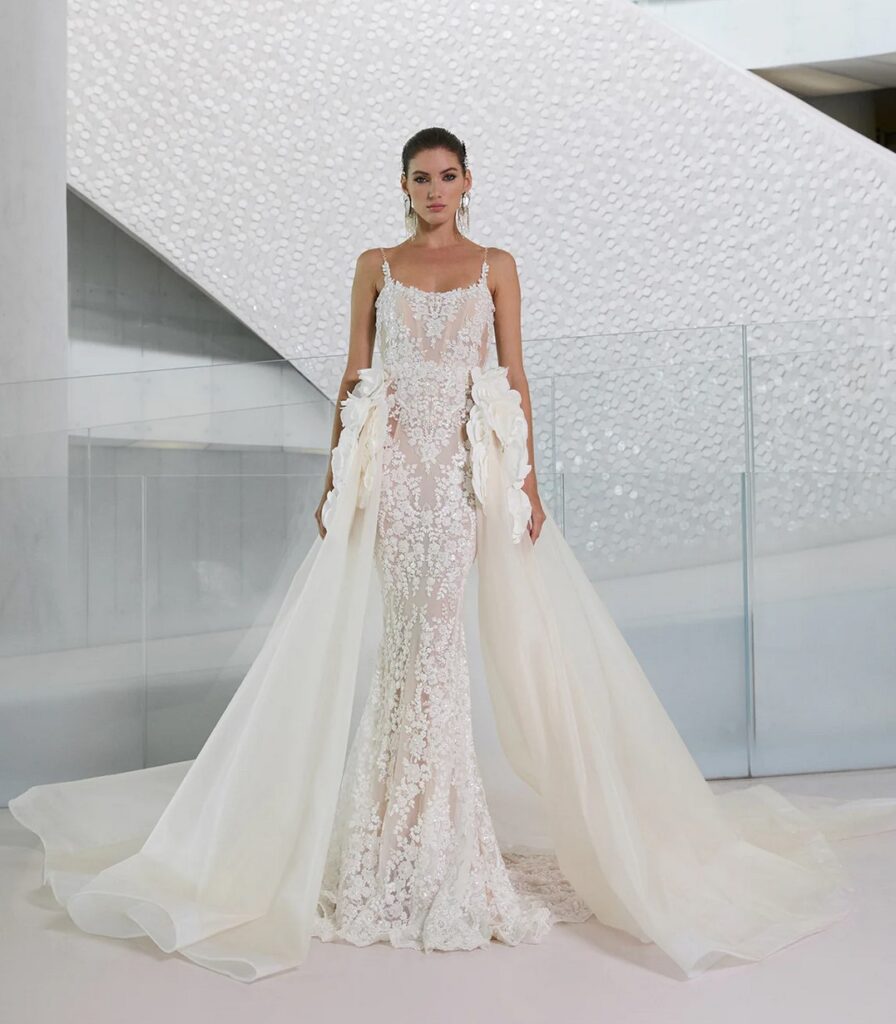 Ancora tema floreale per “Magnifique”, abito da sposa a sirena con un'audace scollatura quadrata e da cut-out trasparenti allungati, realizzati in uno scintillante pizzo ricamato. “Questo design accattivante – racconta la maison - fonde senza sforzo eleganza e fascino, creando una silhouette sorprendente che abbaglia a ogni passo”. Anche questo modello può essere arricchito da una sopragonna che riprende il tema floreale.