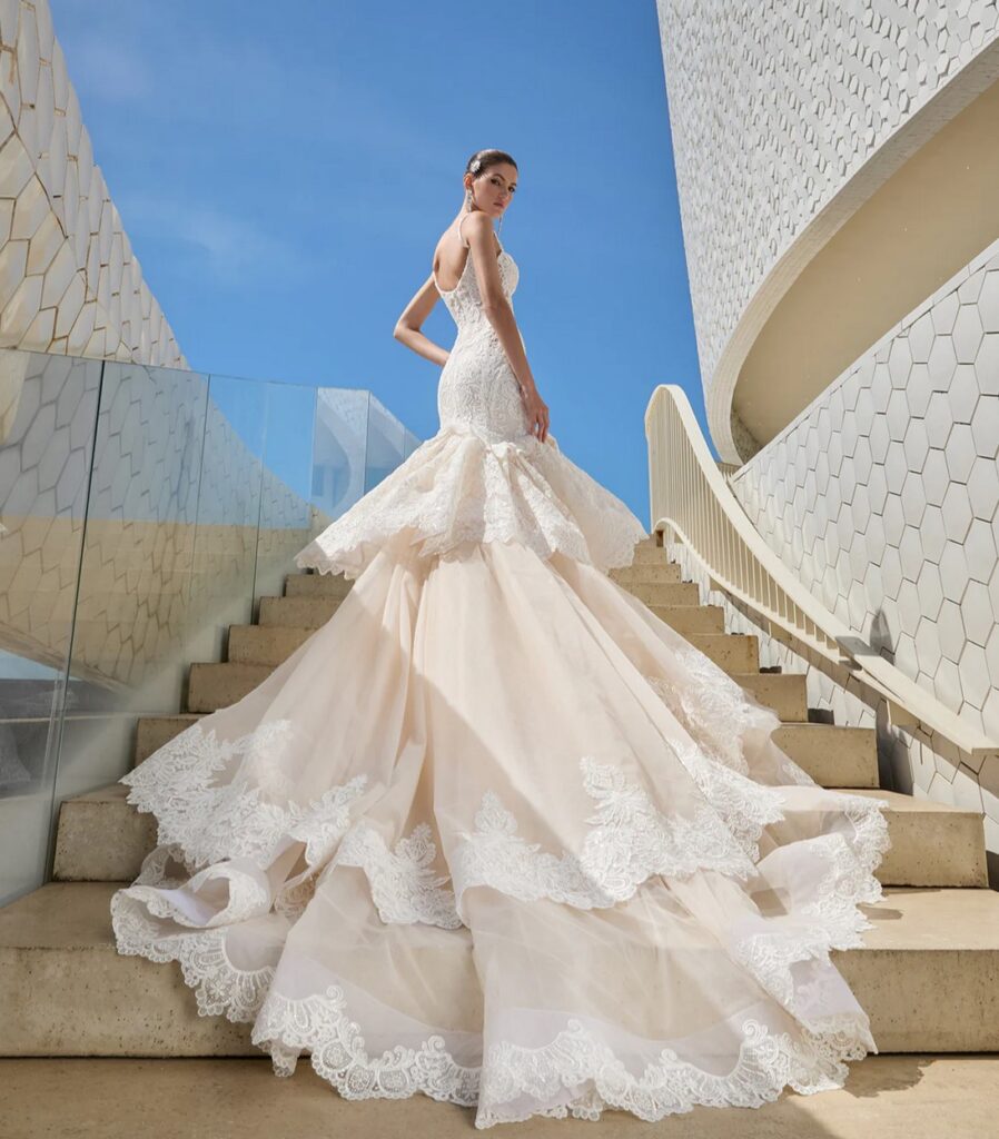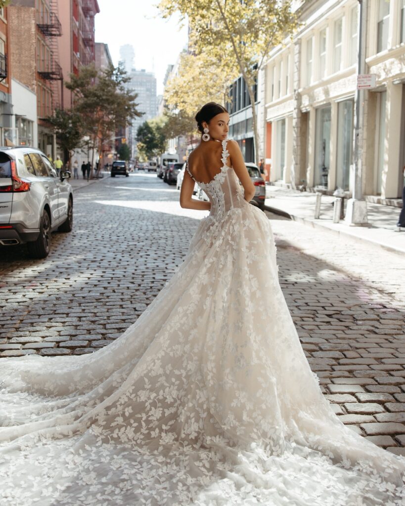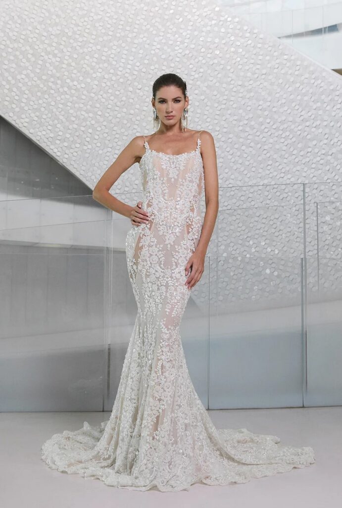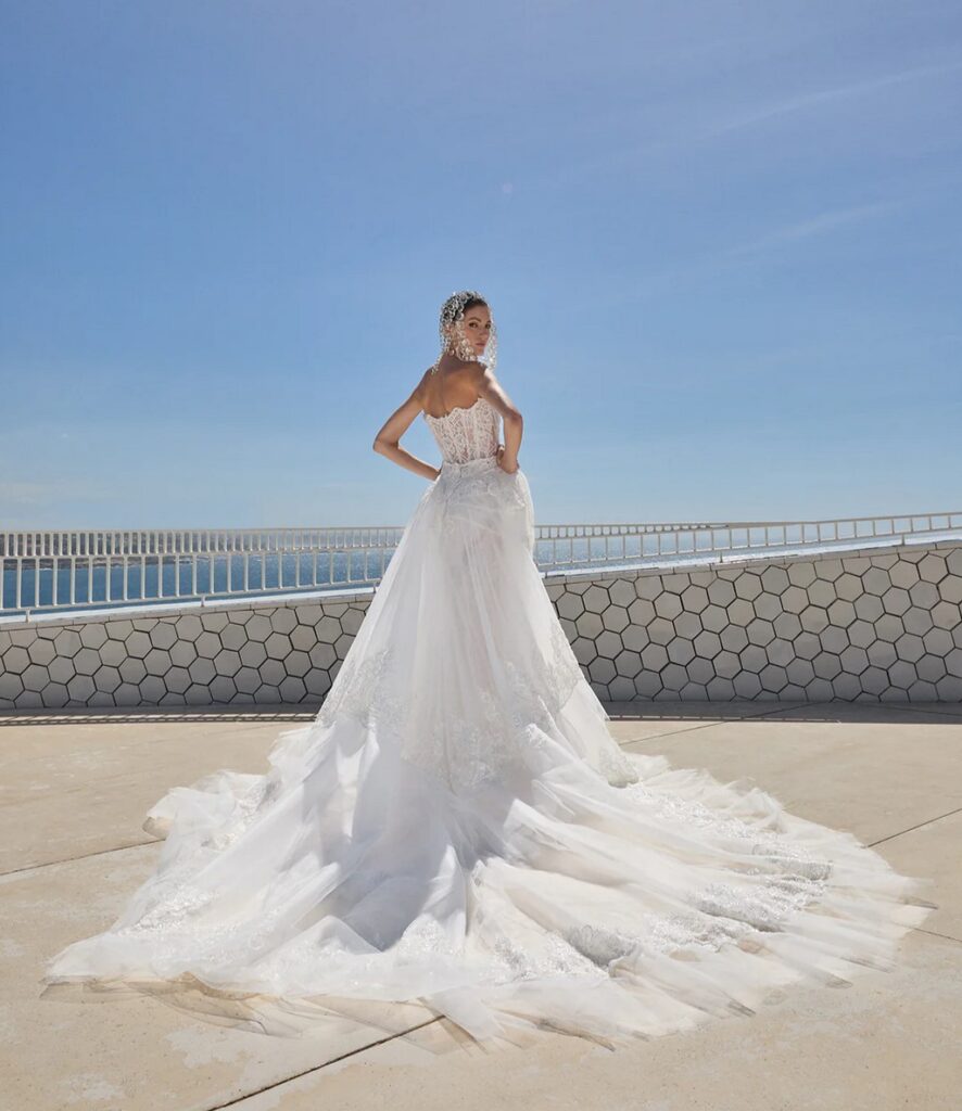 Ancora tema floreale per “Magnifique”, abito da sposa a sirena con un'audace scollatura quadrata e da cut-out trasparenti allungati, realizzati in uno scintillante pizzo ricamato. “Questo design accattivante – racconta la maison - fonde senza sforzo eleganza e fascino, creando una silhouette sorprendente che abbaglia a ogni passo”. Anche questo modello può essere arricchito da una sopragonna che riprende il tema floreale.