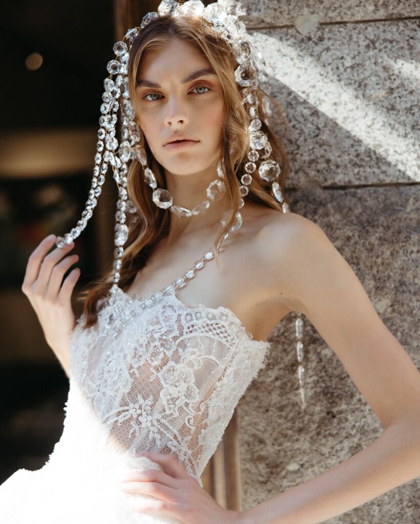 Ancora un abito da sposa a sirena con “Noblesse”, realizzato in pizzo francese, con una cintura impreziosita per aggiungere fascino. “Le coppe a occhi di gatto, drappeggiate in tulle – spiega la maison - creano un punto focale accattivante, mentre le delicate spalline di cristallo aggiungono un tocco di scintillio, elevando questo abito a una visione di raffinata eleganza”.