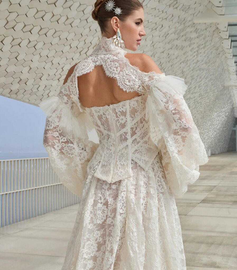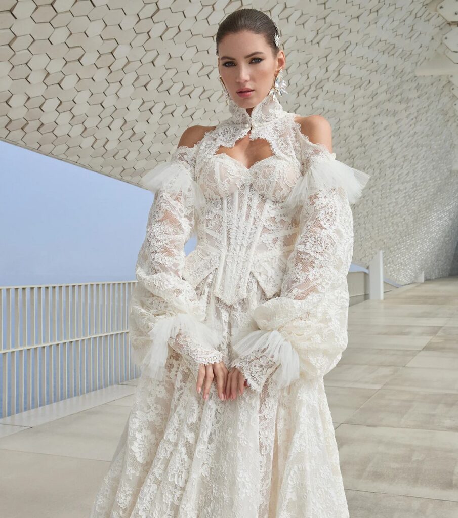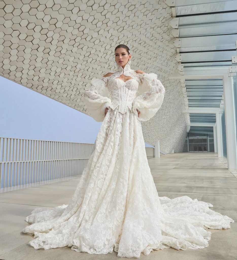 Perfetto per la sposa principessa il bridal outfit “Majestic” composto da corpetto, gonna e bolero: “Vivete un'esperienza regale con questo splendido abito da ballo in due pezzi – invita la maison - realizzato in lussuoso pizzo francese cordonato. Il corsetto geometrico accentua splendidamente ogni curva, mentre la gonna ricca e voluminosa aggiunge un tocco di grandezza. Abbinato a un bolero coordinato, questo ensemble offre una proposta audace adatta a qualsiasi evento reale”.