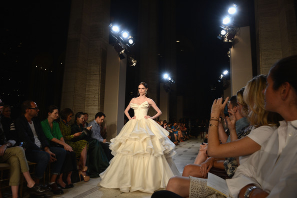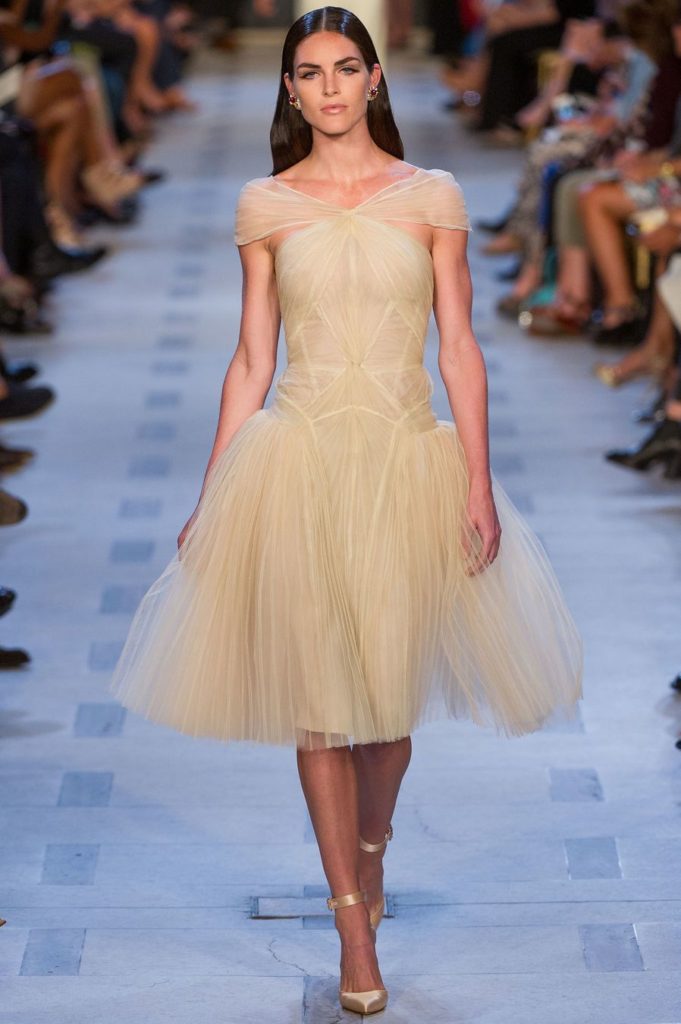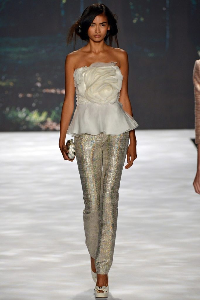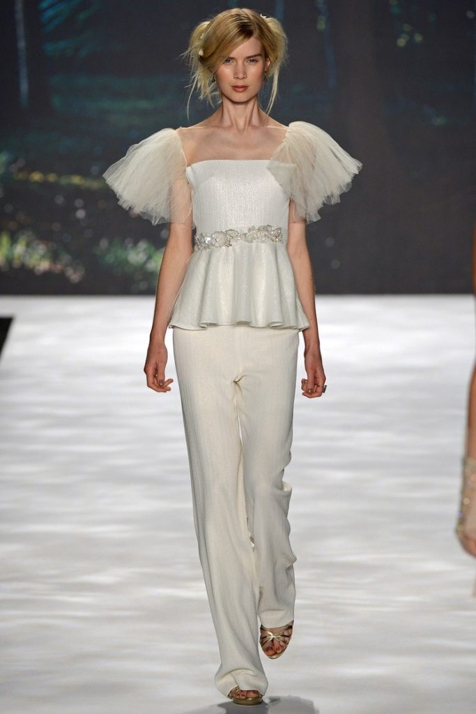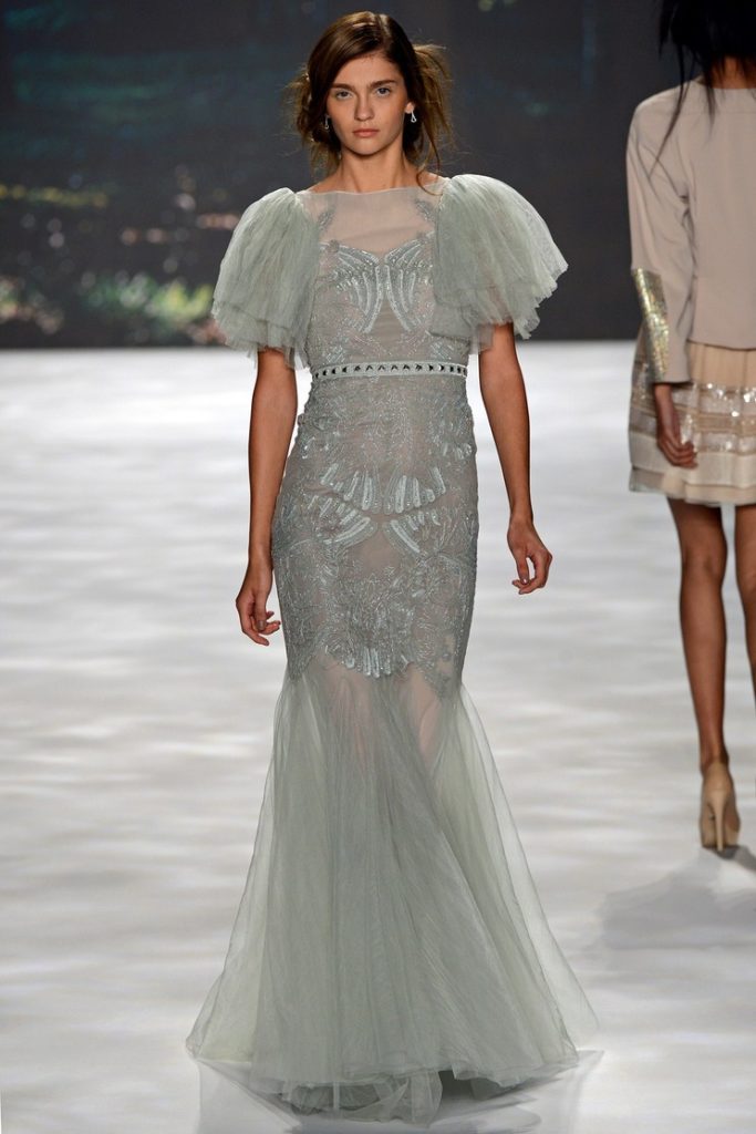 Cominciamo proprio con un focus sui tessuti portato in scena dal duo stilistico Mark Badgley e James Mischka per il brand Badgley Mischka, con una collezione ispirata ad una versione cinematografica del 1935 del “Sogno di una notte di mezza estate” di Shakespeare, che utilizza organza, tulle e chiffon.