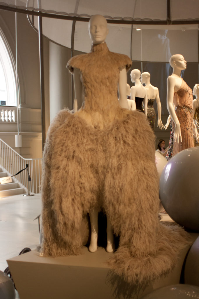 Salendo al piano superiore, nello splendido allestimento dai toni decisamente pop curato da Claire Wilcox, mi imbatto in uno strepitoso Alexander McQueen Spring-Summer 2011 (la prima disegnata da Sarah Burton) interamente in piume, indossato da Daphne Guinnes in occasione dell'inaugurazione della retrospettiva “Savage Beauty” al Metropolitan Museum of Art nello stesso anno.