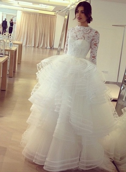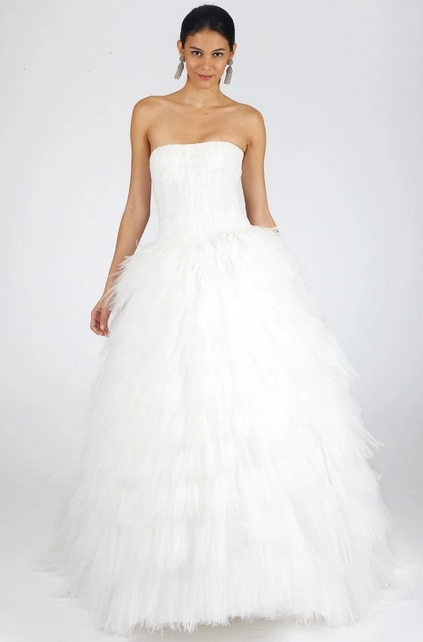 E in chiusura splendido ballgown con corpetto in pizzo, scollo a cuore e trionfo di tulle a balze bordato, in vendita in USA al prezzo di 9.990 dollari (prezzo da brides.com).