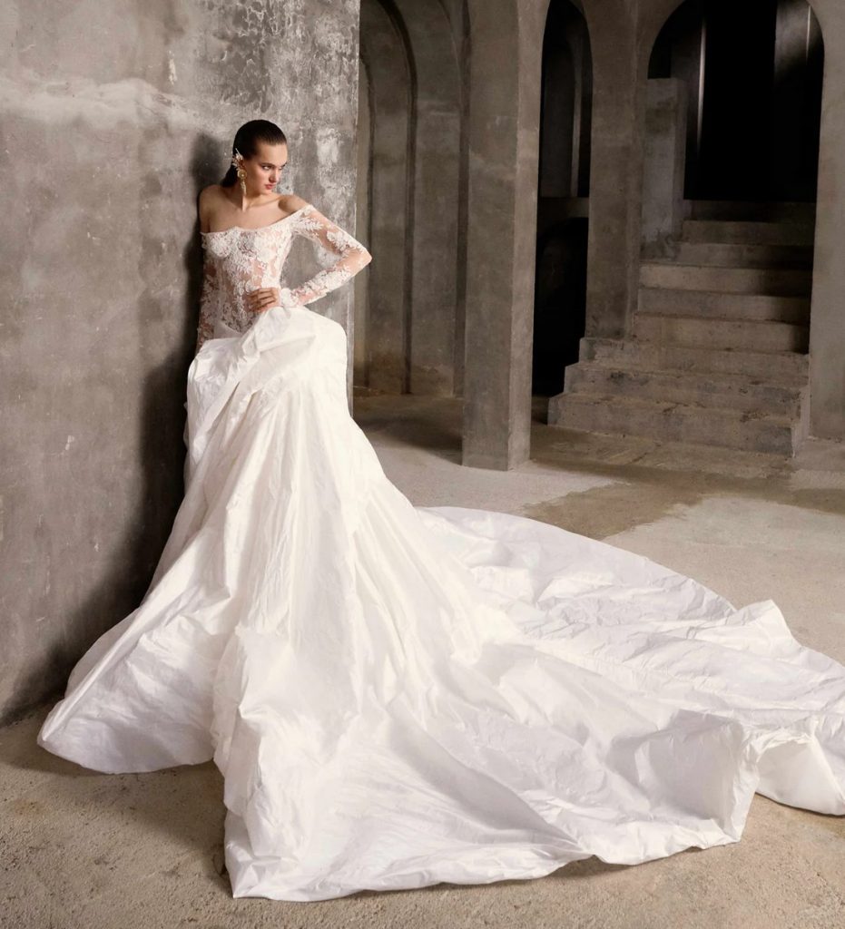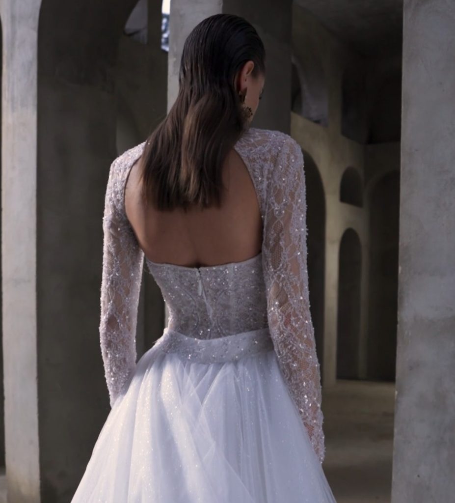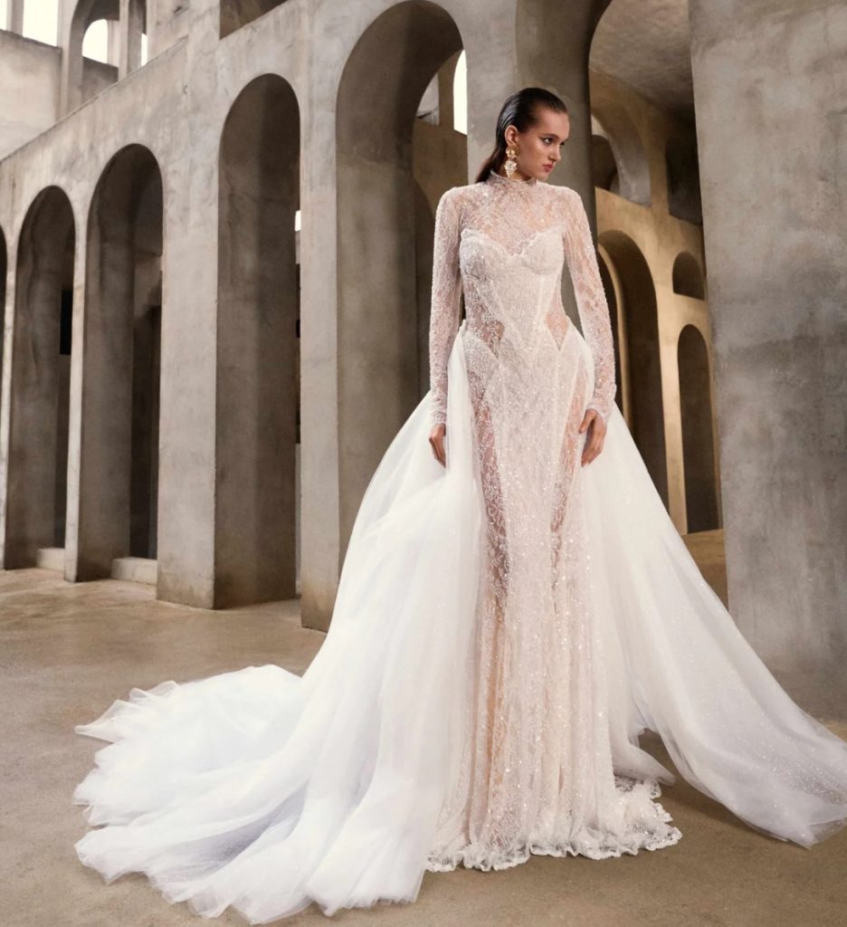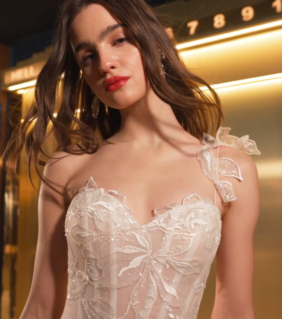Ne abbiamo un esempio con l’abito da sposa “Mariposa”, un'incantevole e lussuosa parata di pizzo impreziosita da dettagli scintillanti e audaci ritagli geometrici. “Un perfetto equilibrio tra scintillio e struttura, progettato per affascinare da ogni angolazione”, come spiega il brand. Con questo modello partiamo da un abito da sposa scivolato con spalline sottili, aggiungiamo un bolero con maniche lunghe ed una sopragonna e completiamo il triplo look da sposa!