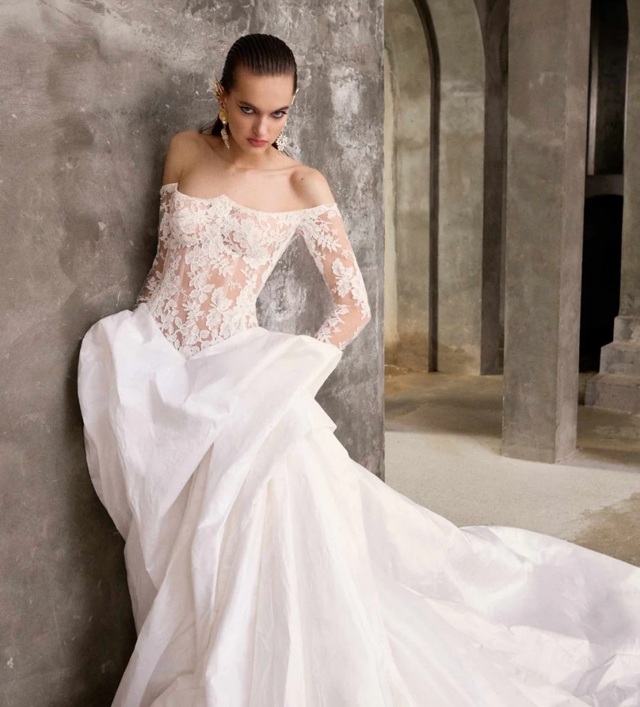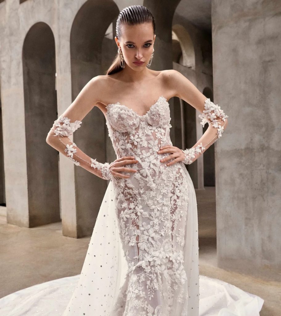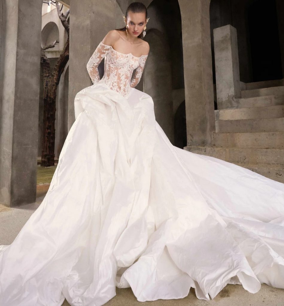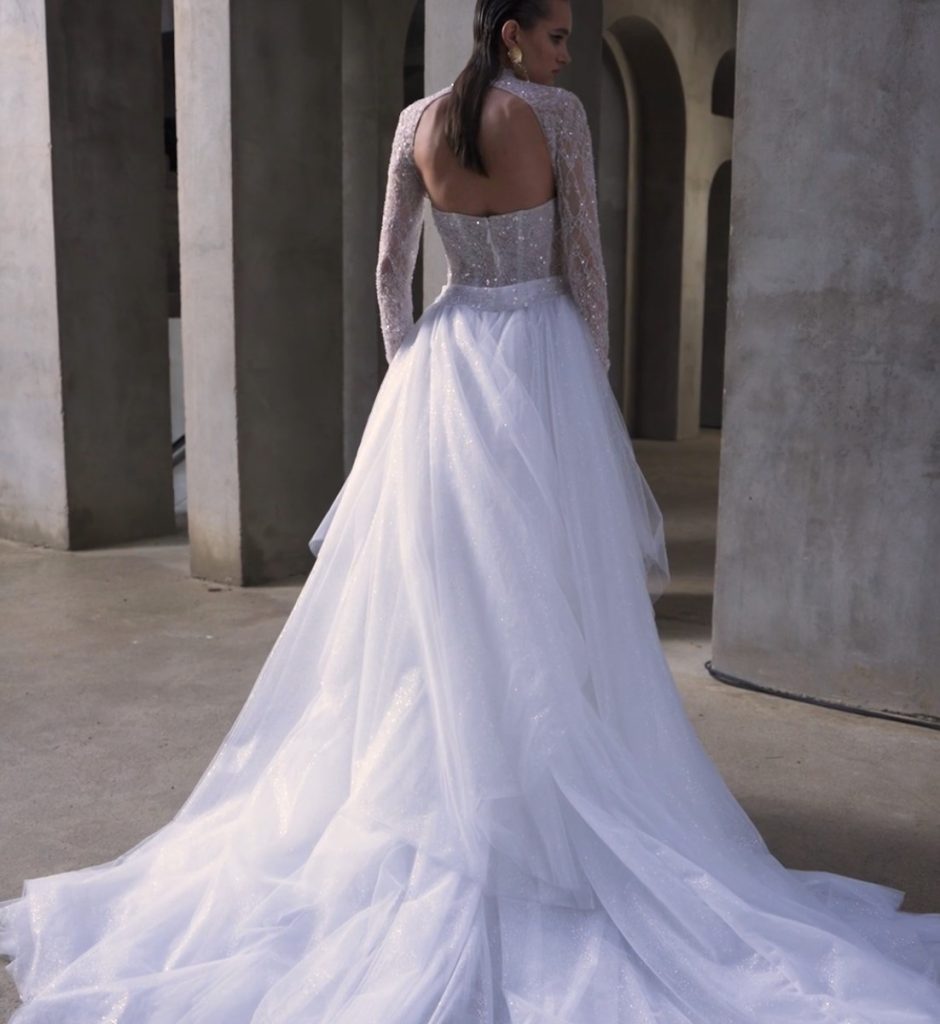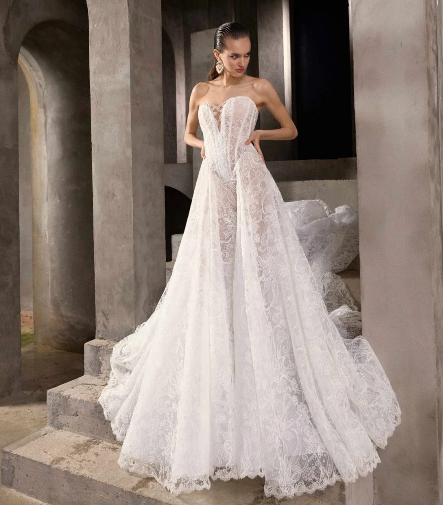 Ne abbiamo un esempio con l’abito da sposa “Mariposa”, un'incantevole e lussuosa parata di pizzo impreziosita da dettagli scintillanti e audaci ritagli geometrici. “Un perfetto equilibrio tra scintillio e struttura, progettato per affascinare da ogni angolazione”, come spiega il brand. Con questo modello partiamo da un abito da sposa scivolato con spalline sottili, aggiungiamo un bolero con maniche lunghe ed una sopragonna e completiamo il triplo look da sposa!