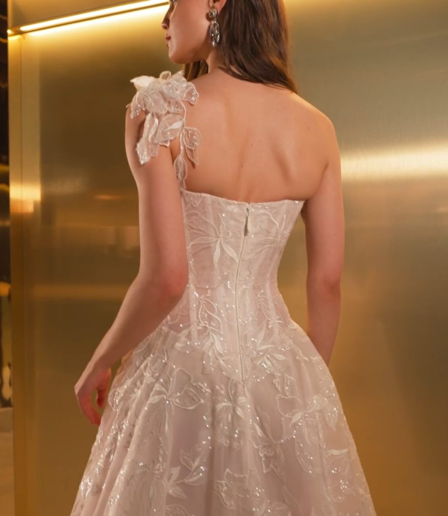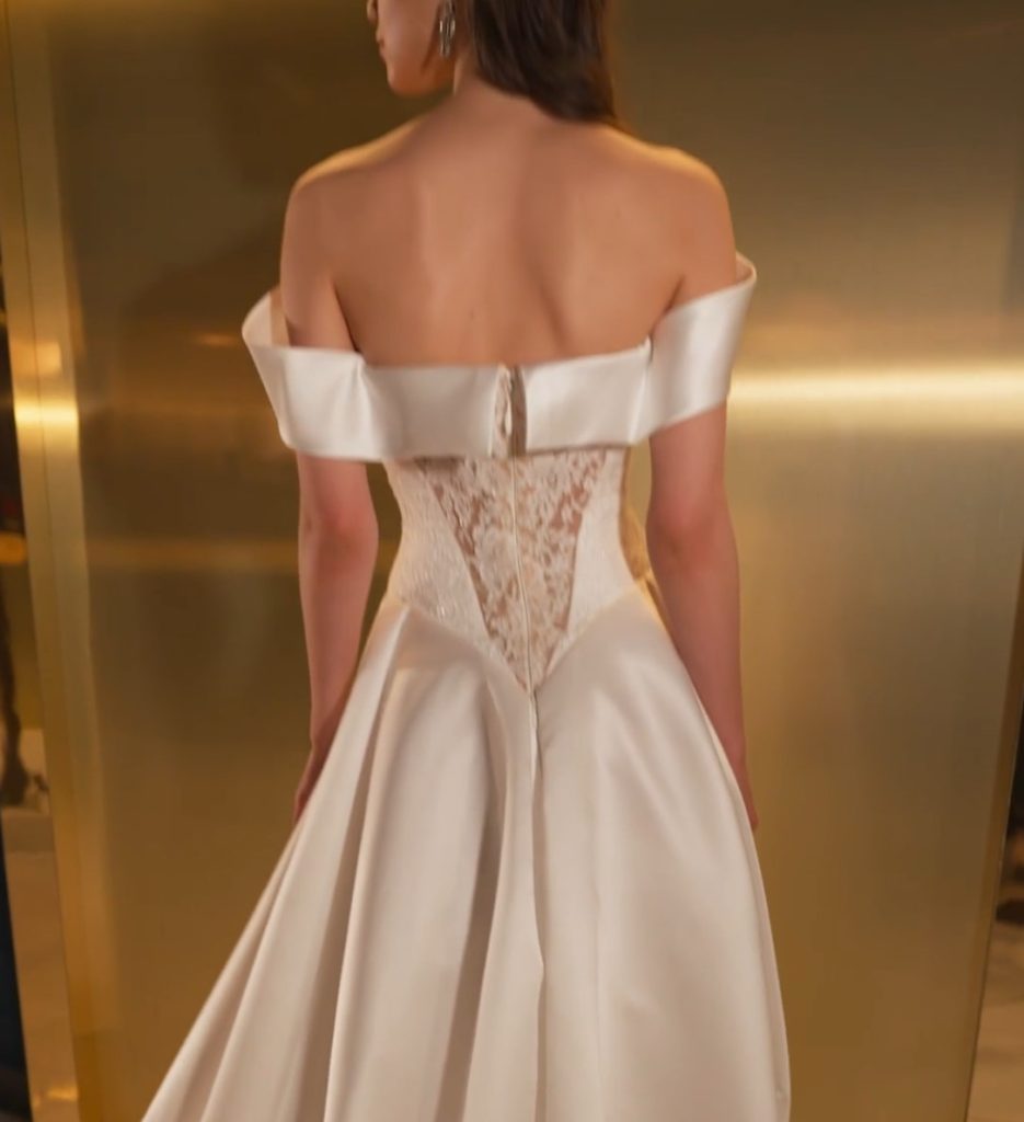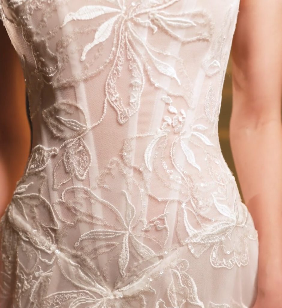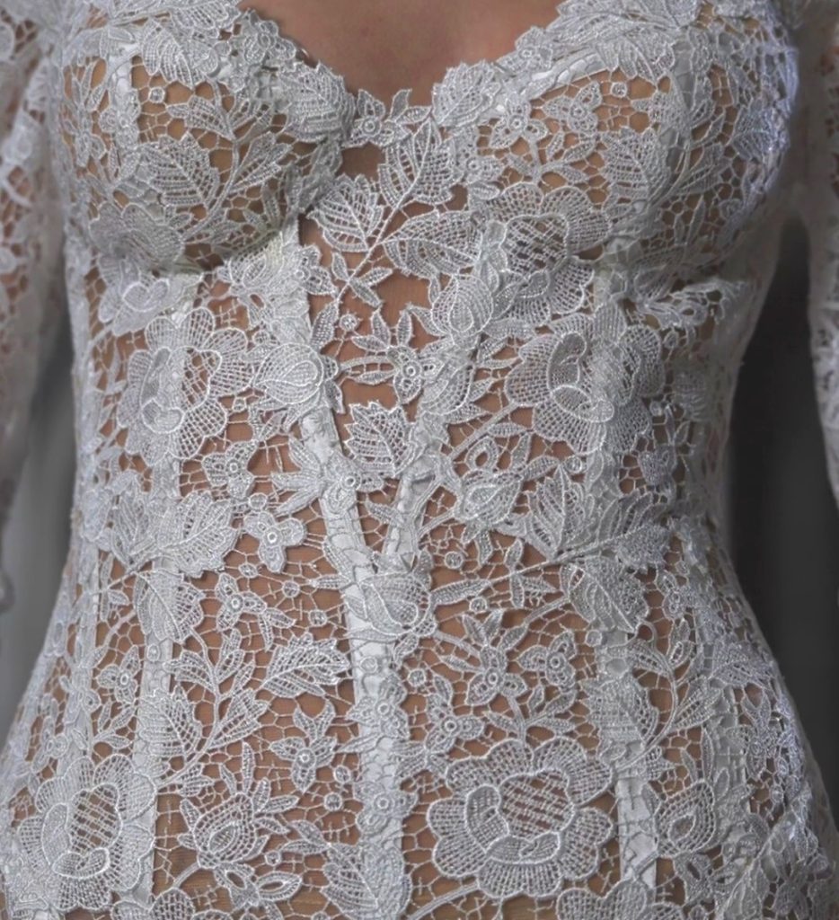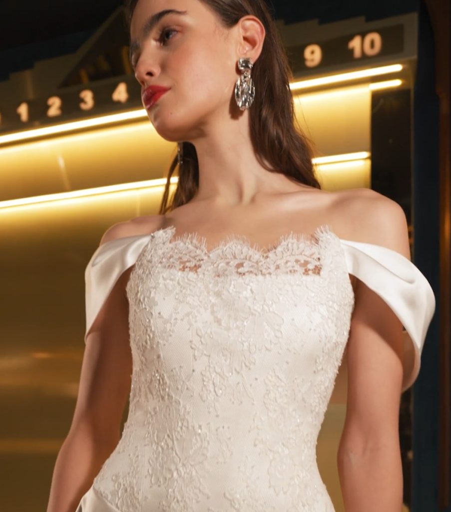 Con “Whisper”, “un sussurro di pizzo guipure francese d'epoca reinventato dà forma a questo sogno a sirena”, spiega il brand. Le disossature a vista accentuano il corpetto strutturato, caratterizzato da una scollatura a cuore e da maniche a guanto off-the-shoulder.