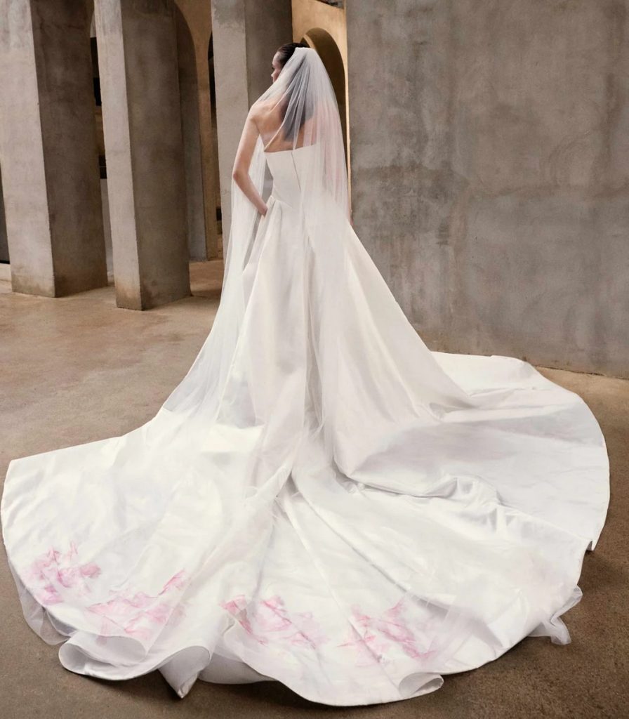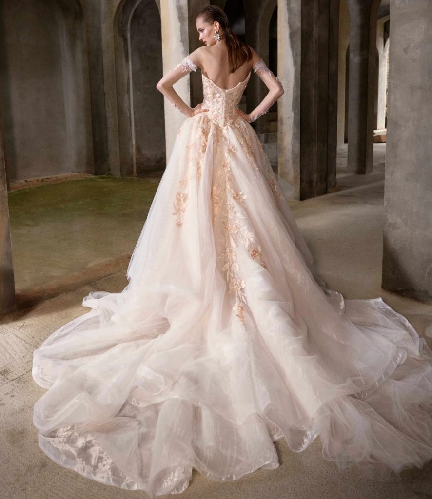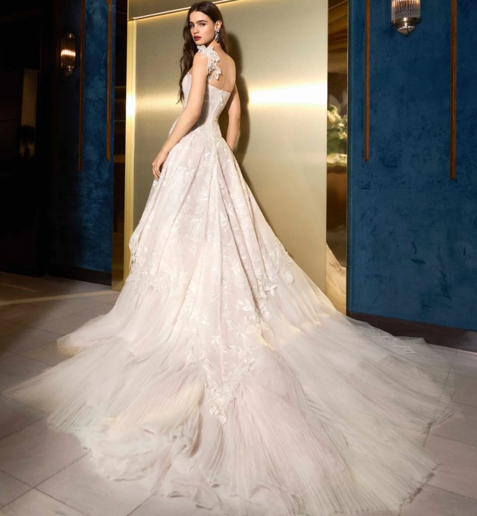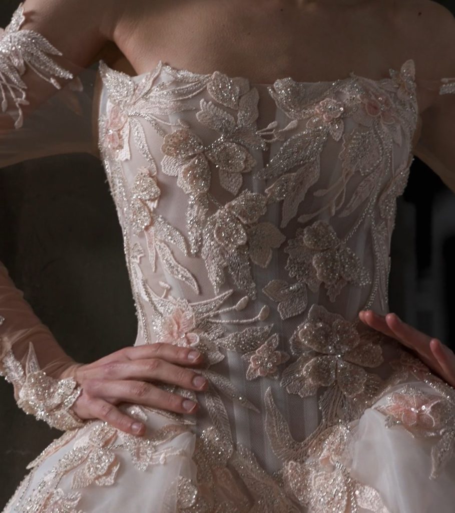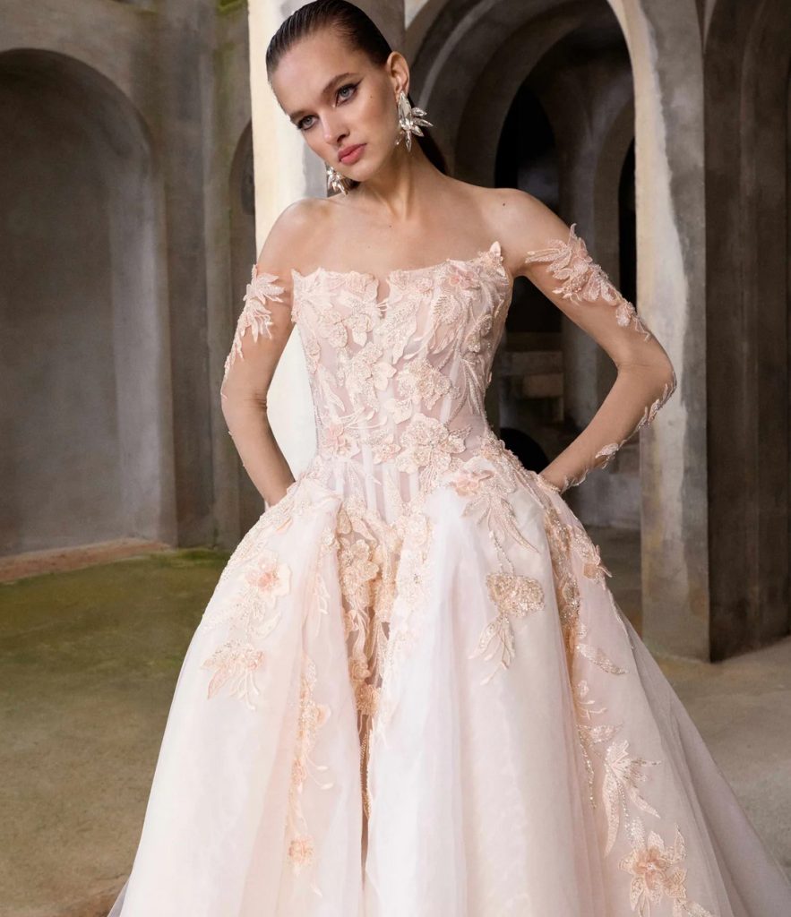 La collezione sposa “Kiss & Tell” accresce la suspense anche con il colore, con l'abito da sposa rosa; ammiriamo gli opulenti ricami floreali con perline in una ricca tonalità cipria su strati di tulle rosa tenue da togliere il fiato, che ammiriamo nell’abito da sposa “Venezia”. La grandezza veneziana prende vita in questo maestoso abito da ballo, caratterizzato da un corsetto a doppio taglio reinventato, da una vita bassa a baschina e da una gonna in tulle multistrato e organza metallizzata. “Le lunghe maniche off-the-shoulder velate, ornate da squisite applicazioni di perline a mano nei colori rosa cipria e champagne, aggiungono il tocco perfetto di opulenza”, spiega il brand.