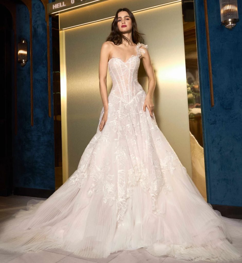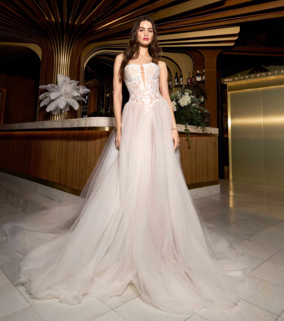 Ancora ispirazione ai ruggenti anni Venti, che prendono vita in “Bellini”, ancora della collezione sposa Galia Lahav Gala Spring 2026; abito rosa ghiaccio A-line in  pizzo scintillante e tulle plissettato. Un corsetto a vita bassa aggiunge struttura, fondendo il fascino vintage con l'allure moderna.