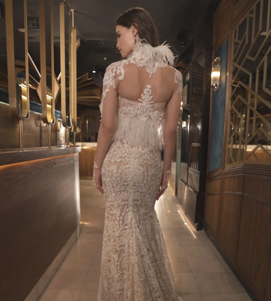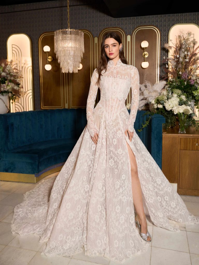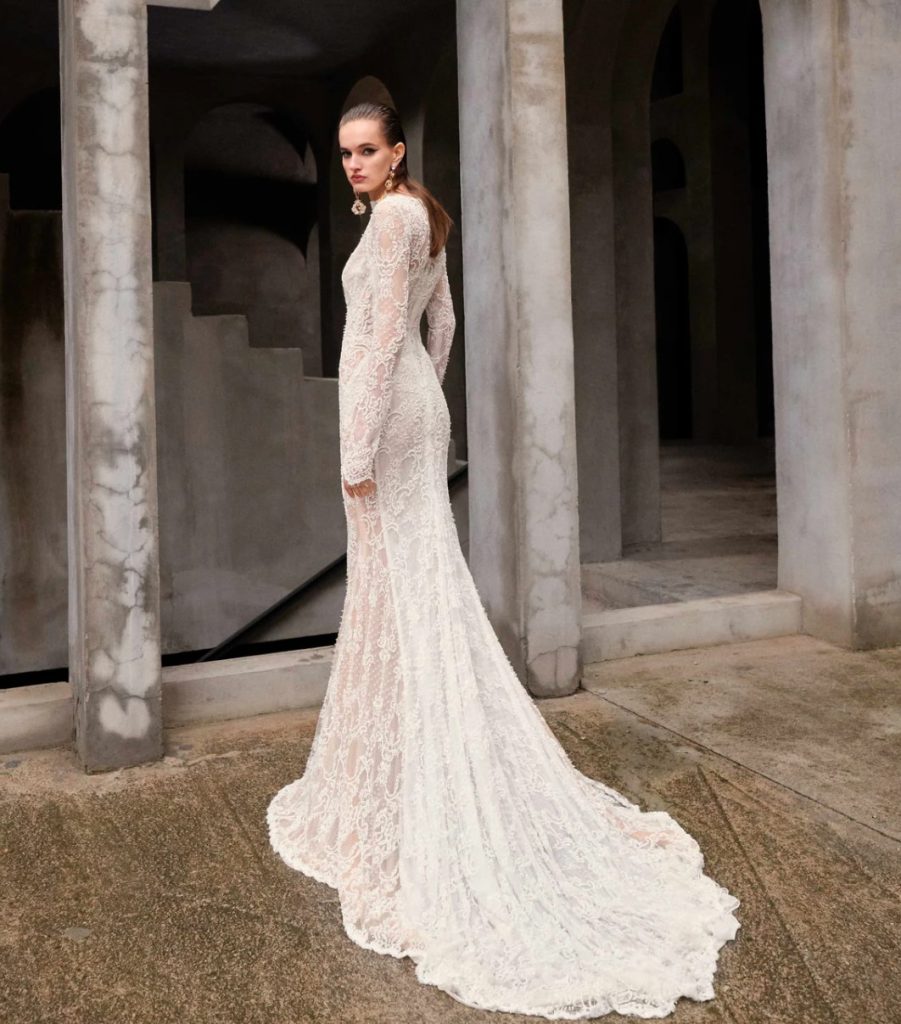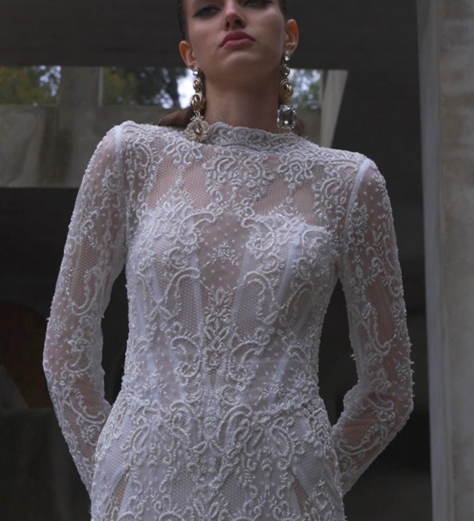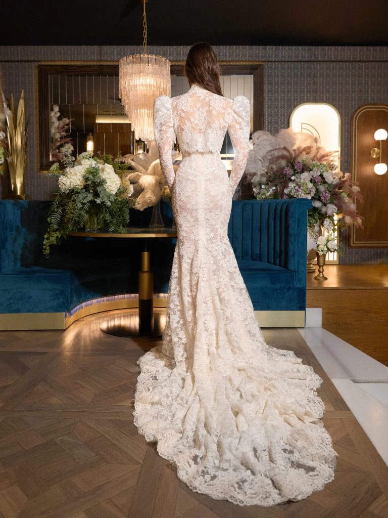 Ancora trionfo in pizzo con “Hermosa”, “una poesia vintage in pizzo integrale raccontata in forma di statuario abito a sirena”, racconta il brand. Lo scollo alto e le maniche complete su misura rendono questo look senza tempo raffinato e sofisticato.